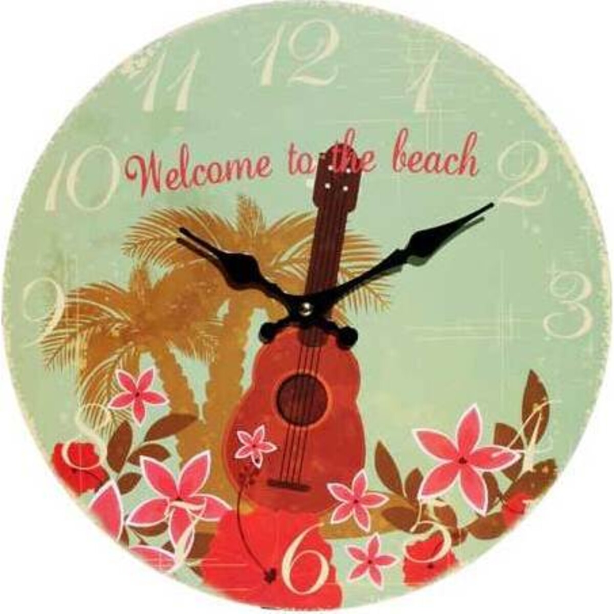 This round vintage-inspired clock consists of a soft pale blue background that features images of tan palm trees, vibrant pink flowers, and a ukulele at its center. "Welcome to the beach" is written in elegant pink script at the top while white numbers and black hands are the final touches. Whenever you look at this clock, you won't be able to help being transported back to your favourite oasis in lovely style. Considering its lovely design, it also doubles as a piece of art that won't be ignored.