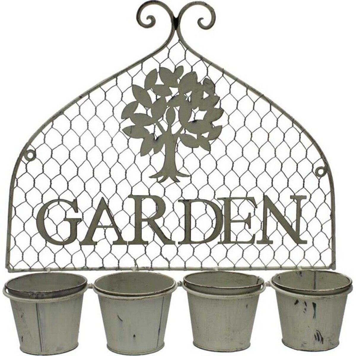 Two metal wires arch upwards where they meet each other in a curly cue. The structure surrounds a canvas of chicken wire on which the metal topiary tree is attached. Beneath the tree it says garden, in all capital letters across the front. Four rings at the bottom of the decoration jut out to accommodate four metal buckets that hang just so. They whole affair is painted a light green colour reminiscent of nature. A row of four metal buckets affixed to the wall can be used in a lot of different ways. One idea is to fill the buckets with fresh flowers from the garden. But it would be just as easy to display four small potted plants inside. There is a wealth of treasure to divide into four buckets.