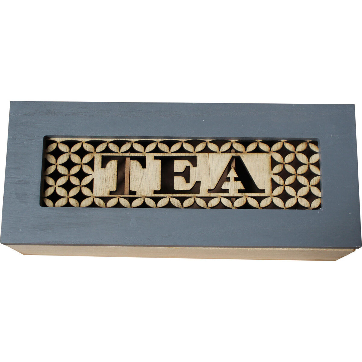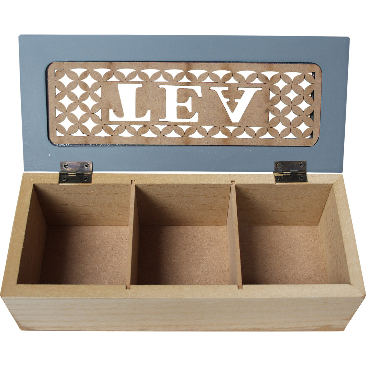 It prominently says ‘tea' on the top-the blue coloured top framed in cut worked sheet of MDF gives it a lovely woody feel that is wholesomely organic and very displayable in its beauty. The white base adds to its dual coloured charm. Made from MDF, hinger sturdily on top, this rectangular box has three large and deep compartments within the box that is as suited fort keeping tea leaves is it is for keeping spices or your collection of keepsakes.