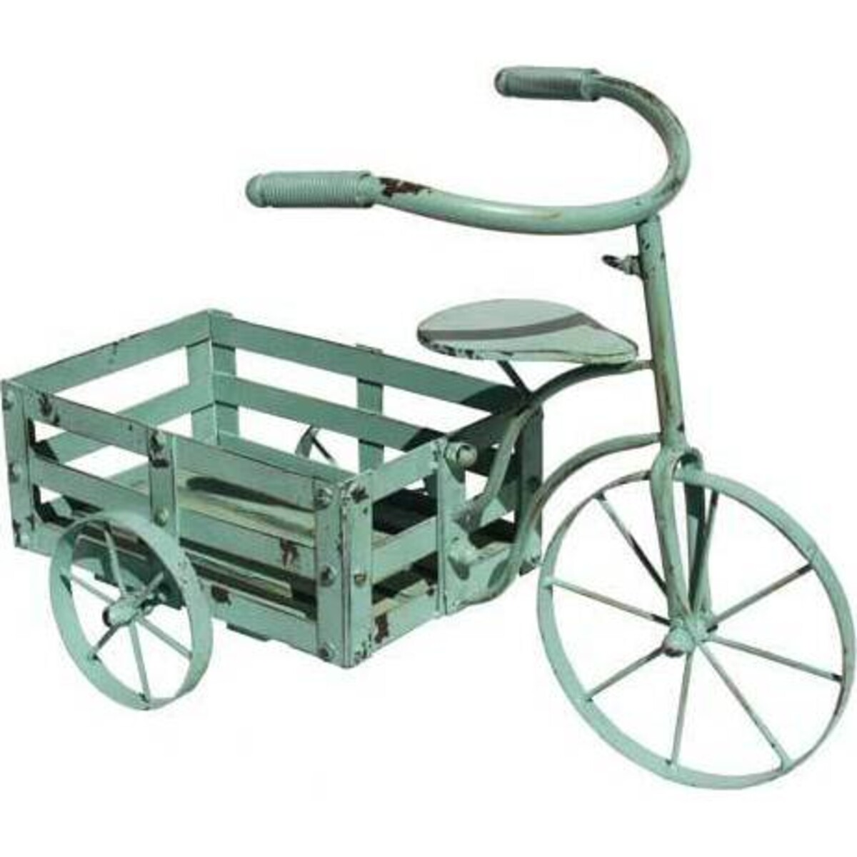 LaVida's Cart Bicycle Blue is reminiscent of simpler times when a bicycle such as this might be used for transporting fruits and vegetables to market. This metal bike, with its cool blue - green painted finish, features distinct areas of aging and rust for an antique appearance. This bicycle measures 53 centimetres long and features a metal basket mounted between two small wheels in the back and a large wheel in front. While certainly scaled down from a real bicycle, this bike can also serve a purpose, such as a place for fresh fruit or a charming holder for napkins at a picnic.