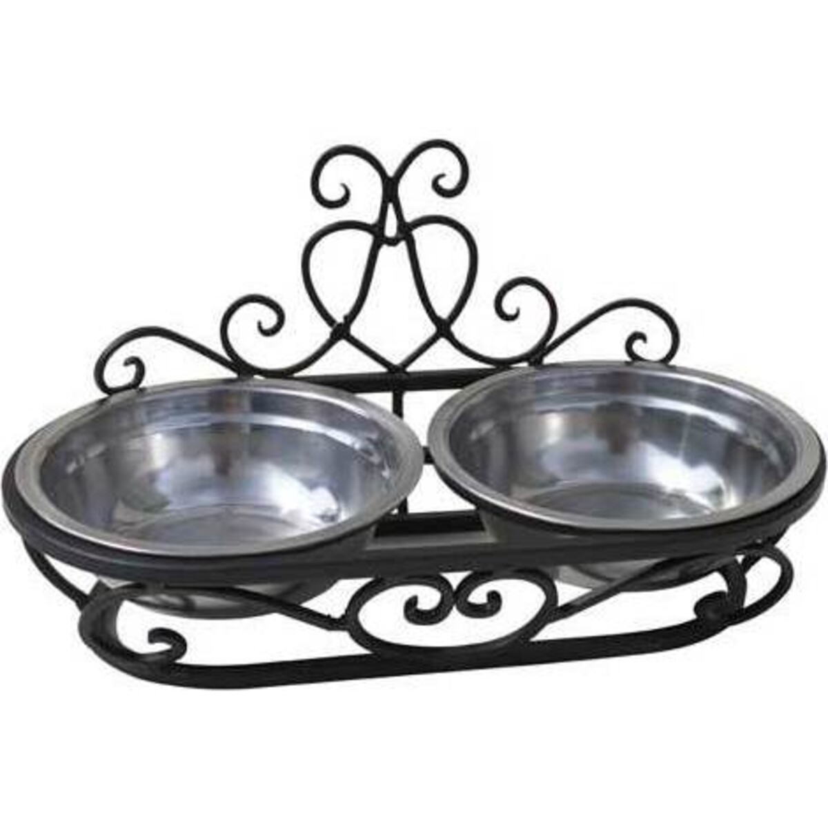 The Cat Bowls Wire by LaVida creates the perfect dining space for the most finicky of cats and their owners. This elegant metal pet bowl stand offers the appearance of hand forged iron in a scrolled design. The oval, metal base is accented with scrolls of metal across the front and sides and a tall scrolled back complete with a center heart. The set is complete with a set of stainless steel bowls that fit perfectly inside the stand. This pet bowl stand not only adds sophistication to kitty's dinnertime, it dresses up the space where the pet eats with a classic look.