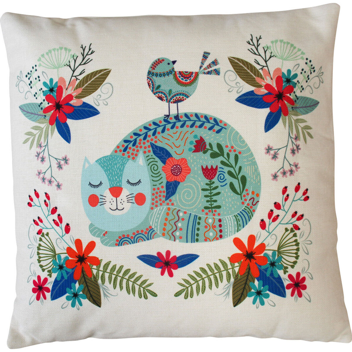 The Cushion Cat Sleeping is a fascinating bed pillow that is better suited for decorative purposes than as a functional pillow. As a functional cushion, it is made of premium quality polyester material and soft, cosy feeling Polyfill. As a decorative pillow, it features a snuggling multi-coloured cat that is sleeping peacefully while an intrusive bird of similar colouration stands on the cat's back. Enveloping both the cat and the bird are floral wreaths of various colours. In all, this cushion is a palette of colourful assortment of army green, orange, red, Maya-blue, `navy-blue and white. The cat has extra features such as long eyelashes and a blushing cheek. This is meant to ensure that this cushion appeals to even children. It would be a lovable fast selling item, so place your order now.