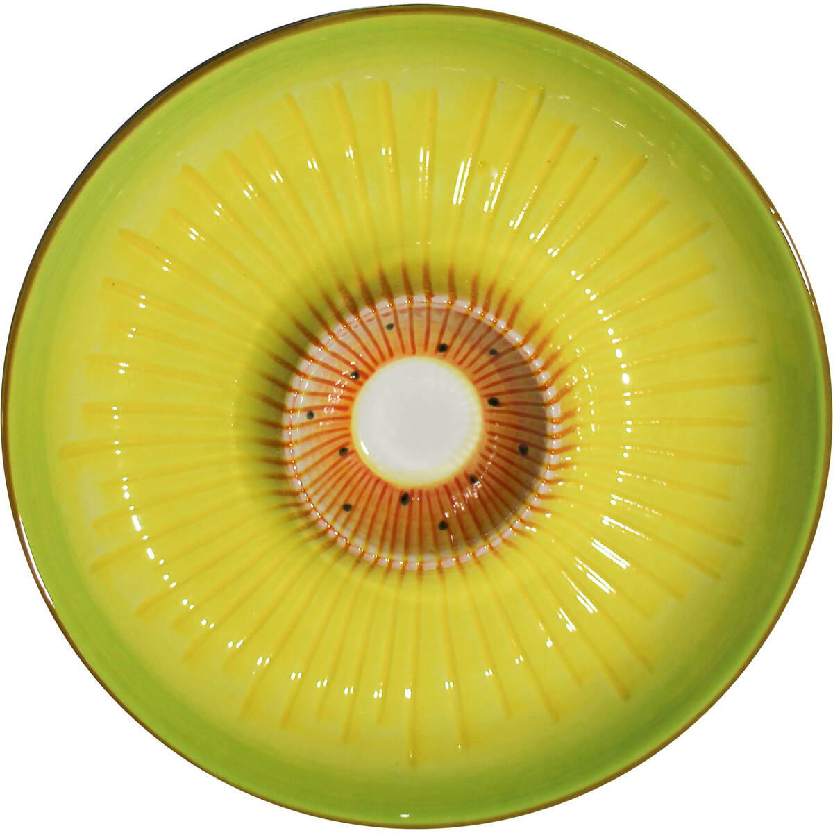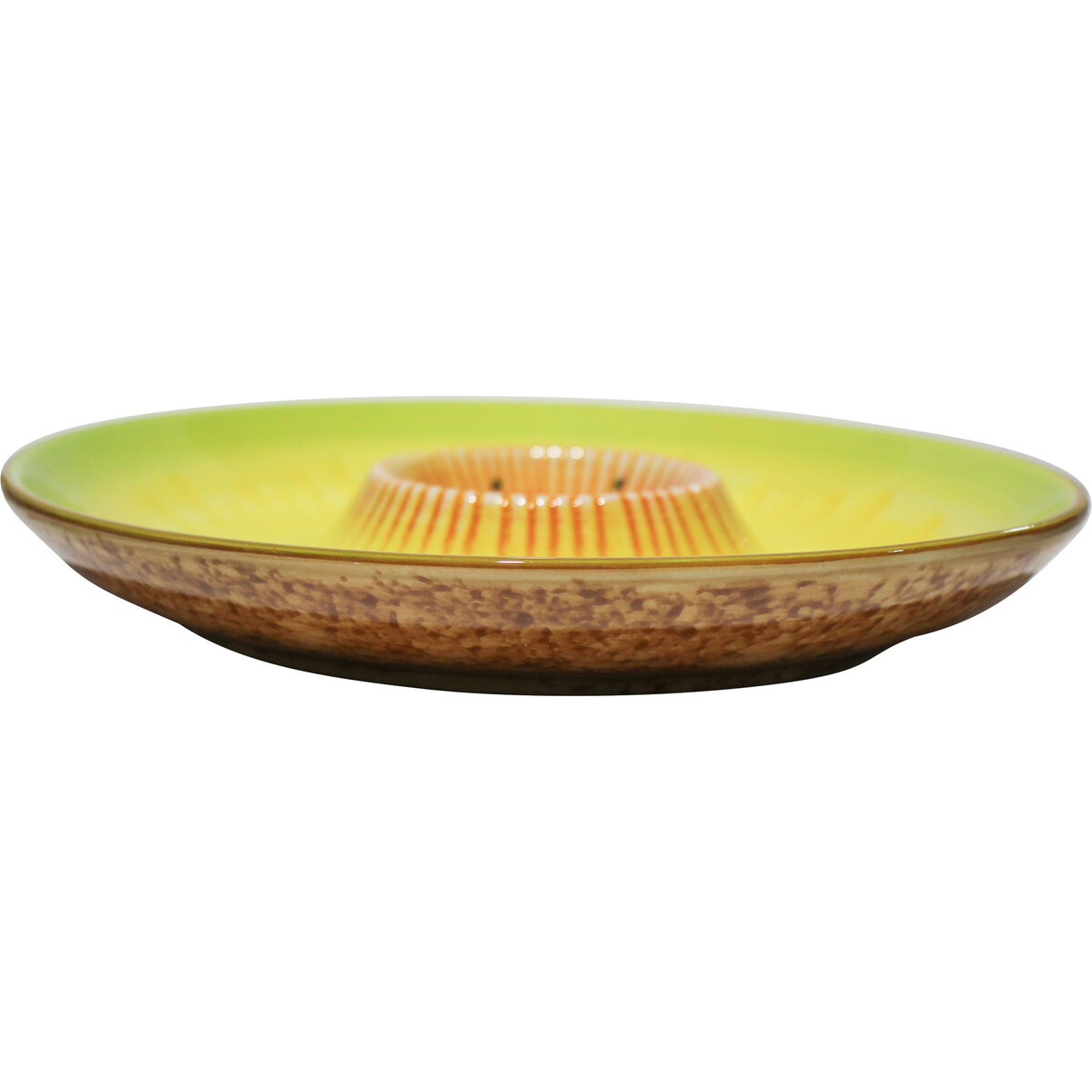 Inspired by the kiwi fruit that has a furry brownish-green skin and bright green interior with rows of tiny, black seeds. This aesthetically appealing plate is created with all the details and feels that make it a replica of the kiwi fruit. Dip Plate Kiwi Fruit is perfect for creating a spectacular centrepiece. An excellent piece for adding a pop of colour to one's decoration when throwing a fun party, barbeque, reception, banquet, or any other event. This plate is large enough to serve varieties of favourite dinners and desserts. Perfect for creating an elegant and sophisticated presentation that makes all the difference at any special event. What's more, it's also suitable for everyday use at home. Dip Plate Kiwi Fruit is a high-quality ceramic piece with a charismatic appeal.