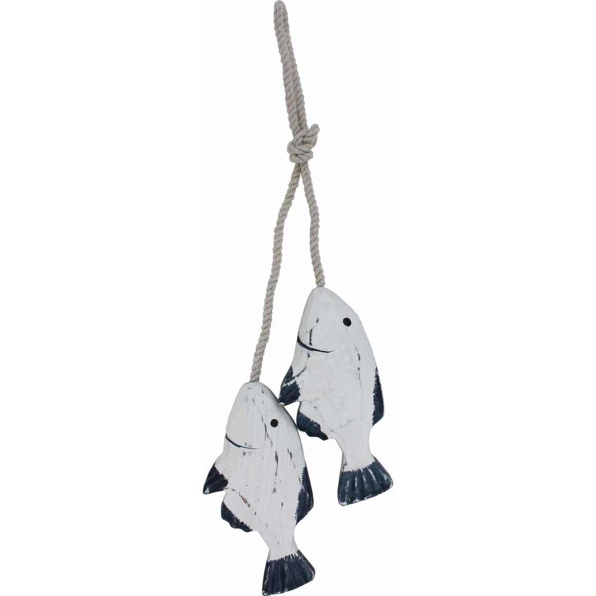 The rustic style White Hanging Fish is a lovely accent piece for anyone who's a fan of fishing and ocean life. The two little white fish have blue fins and gills, black eyes and are hanging from a tan knotted rope.