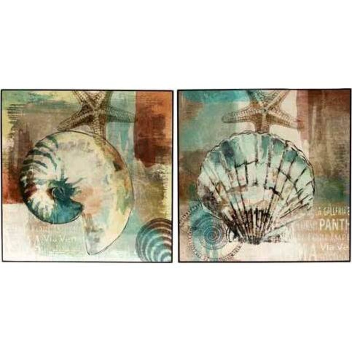 Nothing says ?enjoy a relaxing bath? than a seashell them in the bathroom. Being at the beach is very relaxing, and too few of us get to spend the time we?d like to relaxing in the rays listening to the waves. That?s why people use shells and other beach themed items in their bathroom, to help theme escape to a more relaxing place. This pair of lacquer print bold shells will help you to escape the day to day routine and drift off to a place that is soothing and revitalising. The prints use a range of muted colours such as turquoise, blue, green and brown to bring life to a pair of different shells. In the first print a curved shell and a star fish can be seen, and in the second image a normal layered shell can be seen. The combination of warm and cool colours is reminiscent of the cool sea breeze on warm sand.