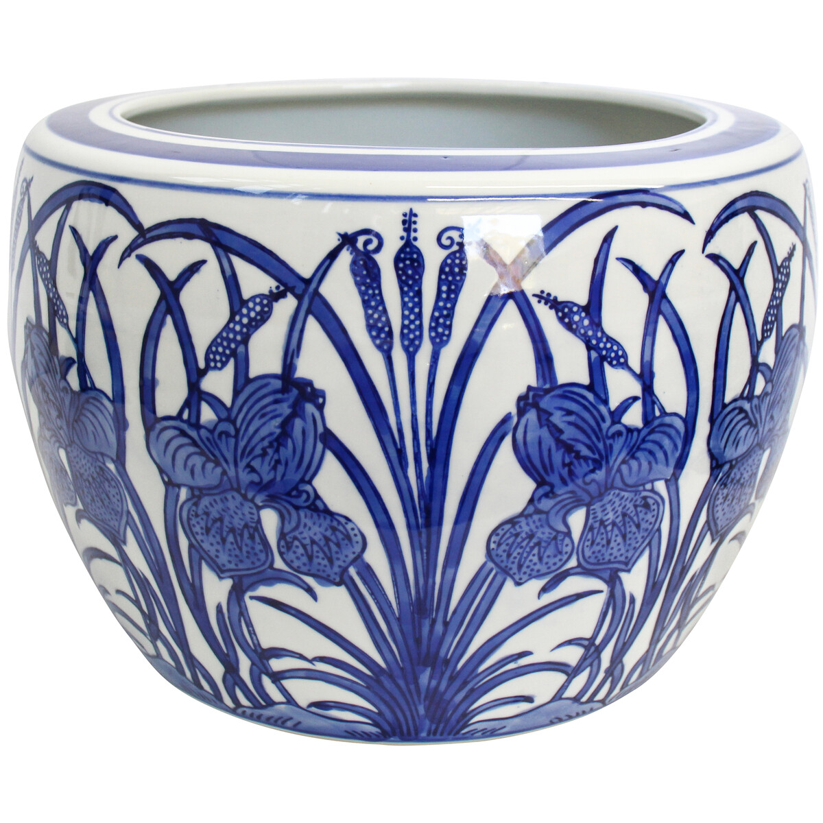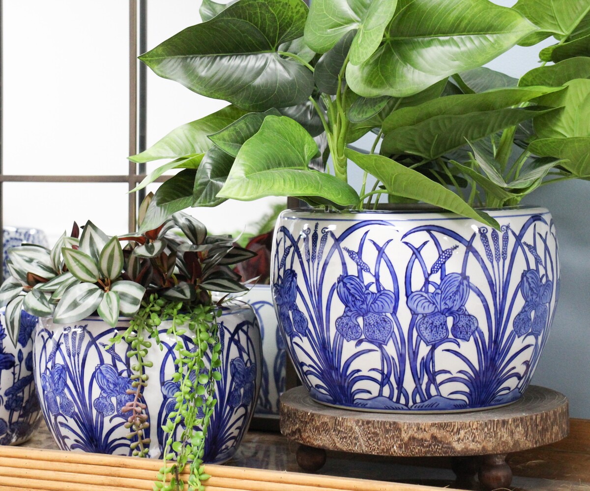 Given the fact that it is made in a cylindrical shaped, large sized dimension which measures 29 centimetres in length, 29 centimetres in width and stands at 21 centimetres in height, this #Planter Iris/Rush XL would make a bold ornamental statement wherever it is displayed! Its cylindrical shapeliness, the choice of a universally appealing theme - flowers, and its luxurious use of navy shade of blue in painting these flowers are some of the unique features which makes this planter irresistibly alluring! Please note that it is hand painted and as such, each piece is unique as there is bound to be slight variations in finish and painting.