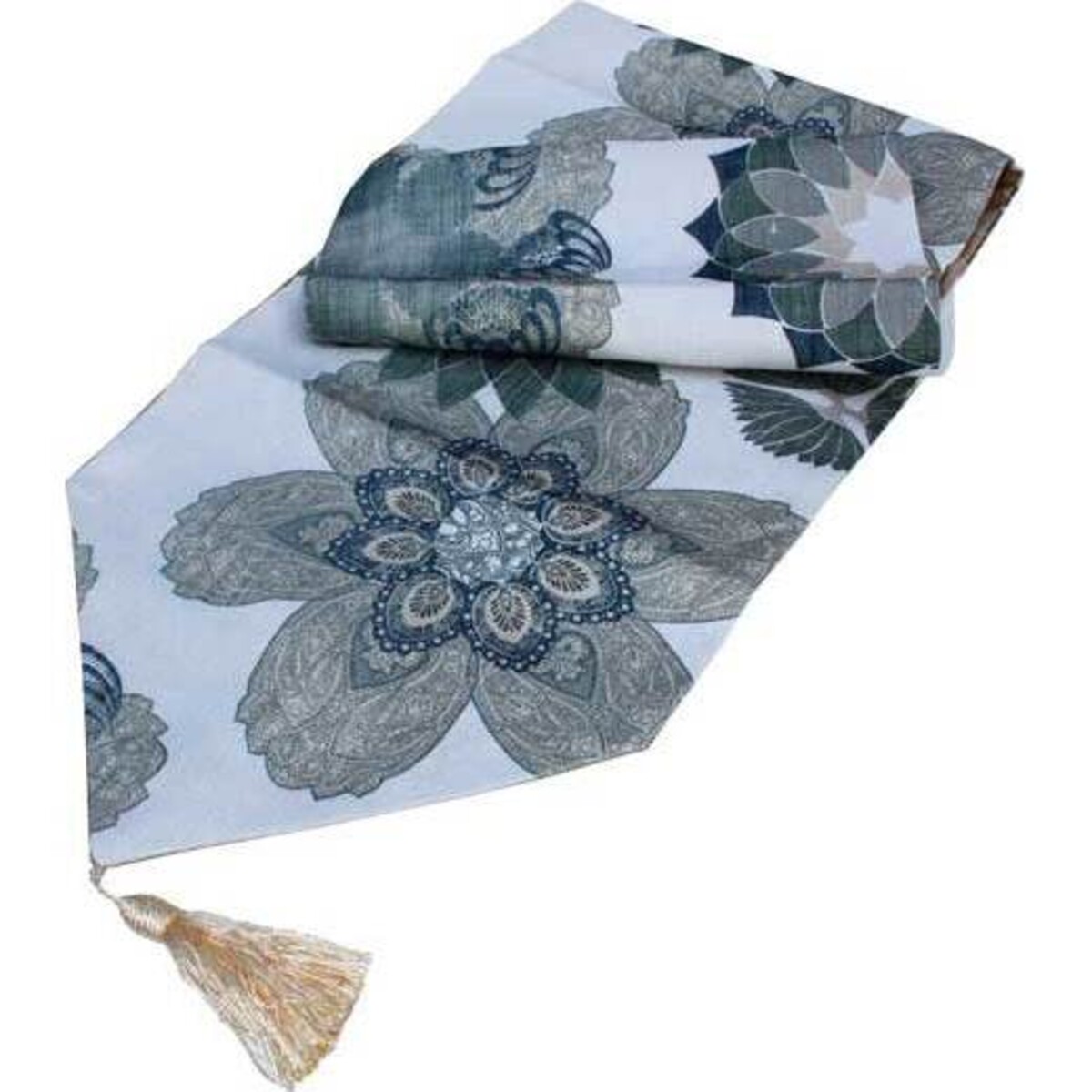 This White Flower Cerchio Runner from Lavida is going to add a bright burst of colour to your table. The white runner features a bold blue floral design with hanging tassels on either pointed end. Place it across the center of your table and it not only serves as a d_cor piece, but can also protect your tabletop from scratches and scrapes due to the movement of serving-ware. Isn't it great when a beautiful piece can also do double duty for function?