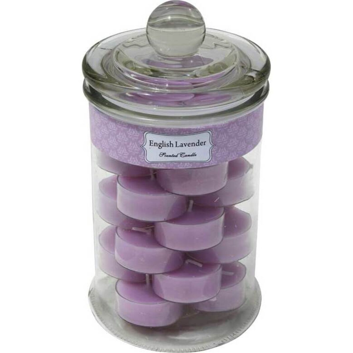 T - light jar lavender displays an artistic glass design. It consists of a base and several circular plates superimposed on each other at each level upwards. This pattern changes into regular circular shape for a few inches before reaching the top, which is covered by a glass lid. The brand English Lavender is prominently displayed on this part to the side. Inside the cylindrical container is the purplish colour of lavender. User can utilize this product for generating fresh scents in diverse locations of the home. The air - freshening item utilizes special wax for extended application and its aesthetic craftsmanship makes it suitable for a romantic picnic or evening dinner.