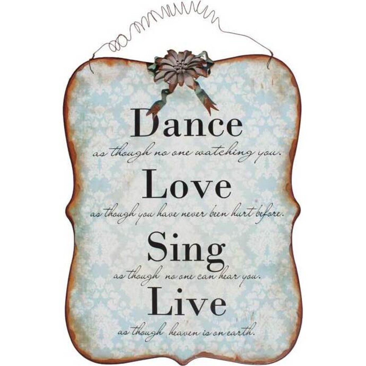 This tin sign has a curious shape that will attract the attention: roughly square but in the shape of curly brackets. The sign is suspended by a spring-like wire at the top for easy positioning by a hook or fixing. A ribboned flower compliments the design and leads the eye to the messages beneath. With subtle patterns of blue and white in the centre, the sign is bordered by a rustic worn edge to frame the central text. "Dance as though no one watching you" announces the first message in black with beautiful fonts that are striking and elegant in composition. "Sing as though no one can hear you" is another example of sayings that lift the spirit and encourage the viewer to express themselves in positive ways. This tin sign is perfect for a visitor's bedroom perhaps, or the hallway, where the sayings will be warmly appreciated by all.