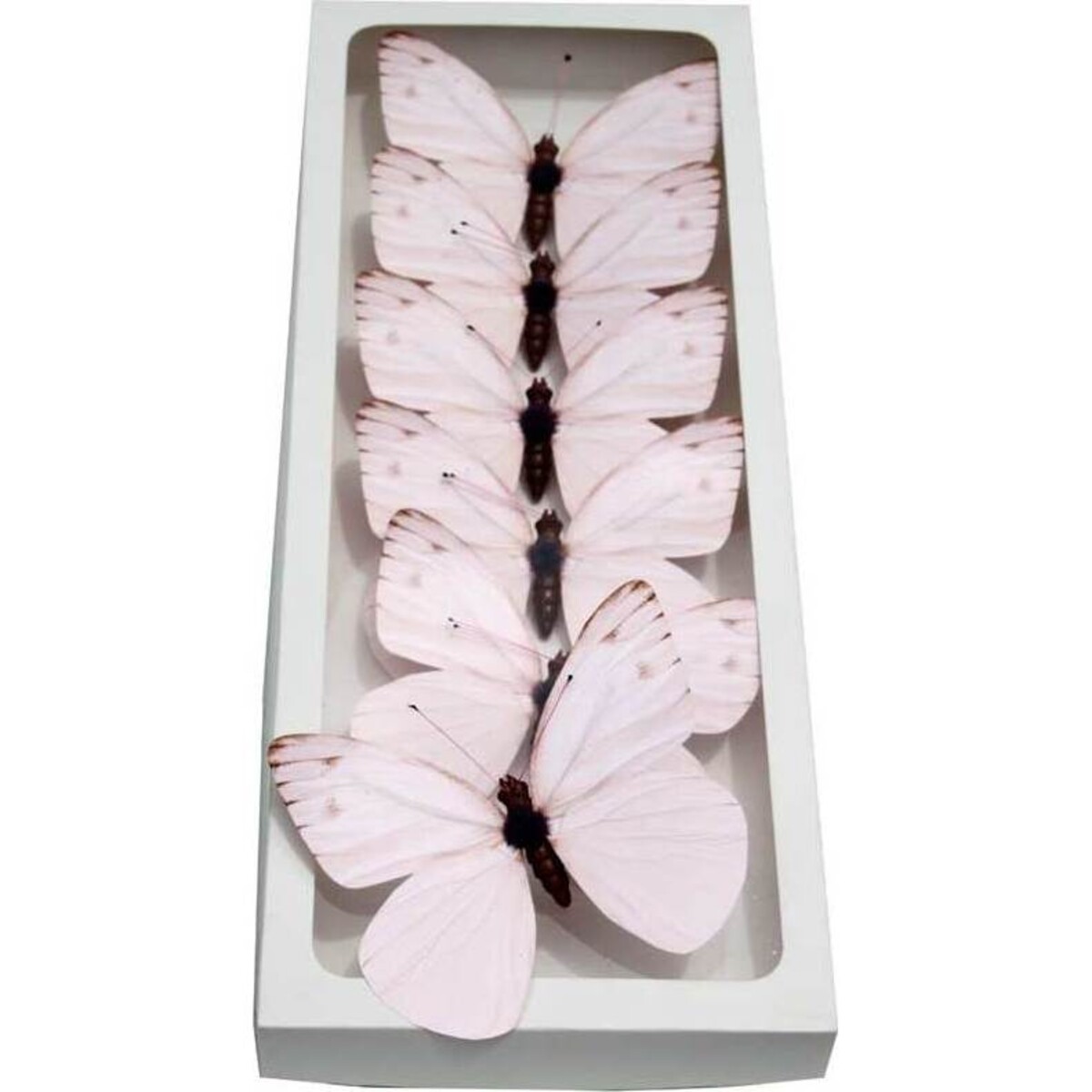 Each of the six butterflies has pale pink wings with just a touch of dark pink along the top edges. The dark abdomen, thorax, and head offer a perfect contrast to the light wings. Whether you put these butterflies on a bouquet of flowers, outside on bushes, or as part of a centerpiece, you'll adore them so much you'll look for any excuse to display them. While they're perfect to use on a daily basis around your home, they're just as ideal to use for a formal occasion, such as for a formal garden wedding.