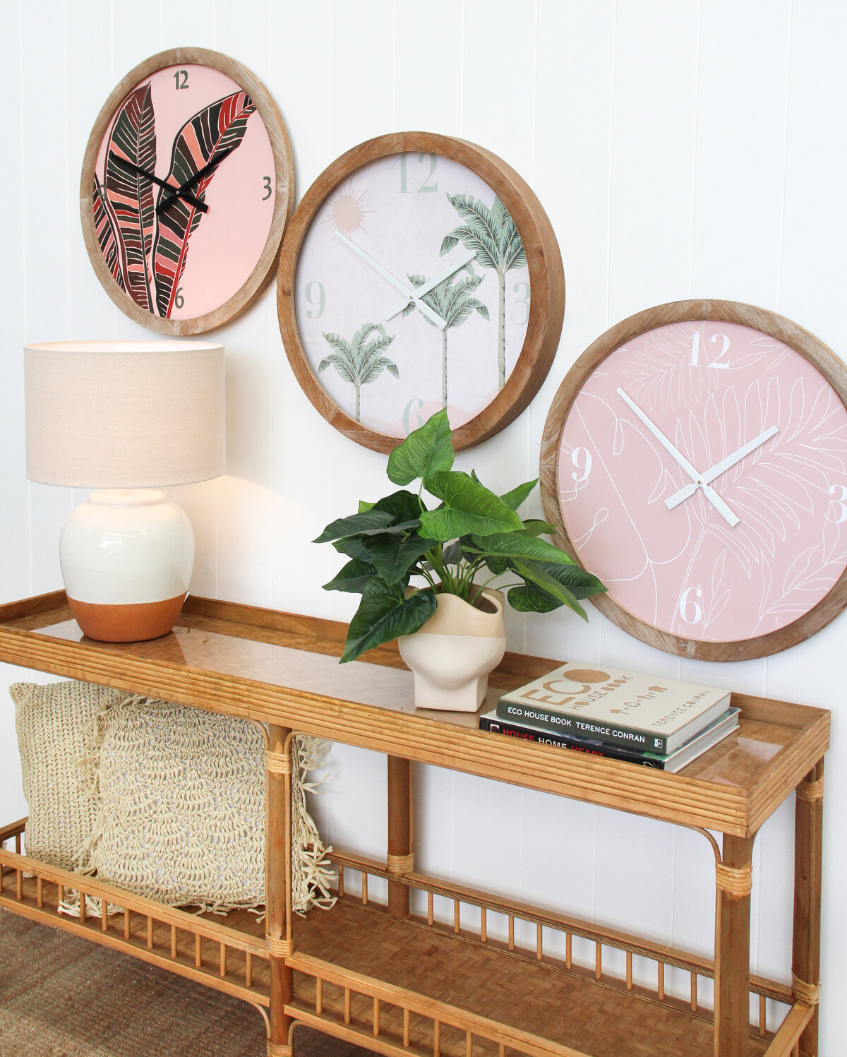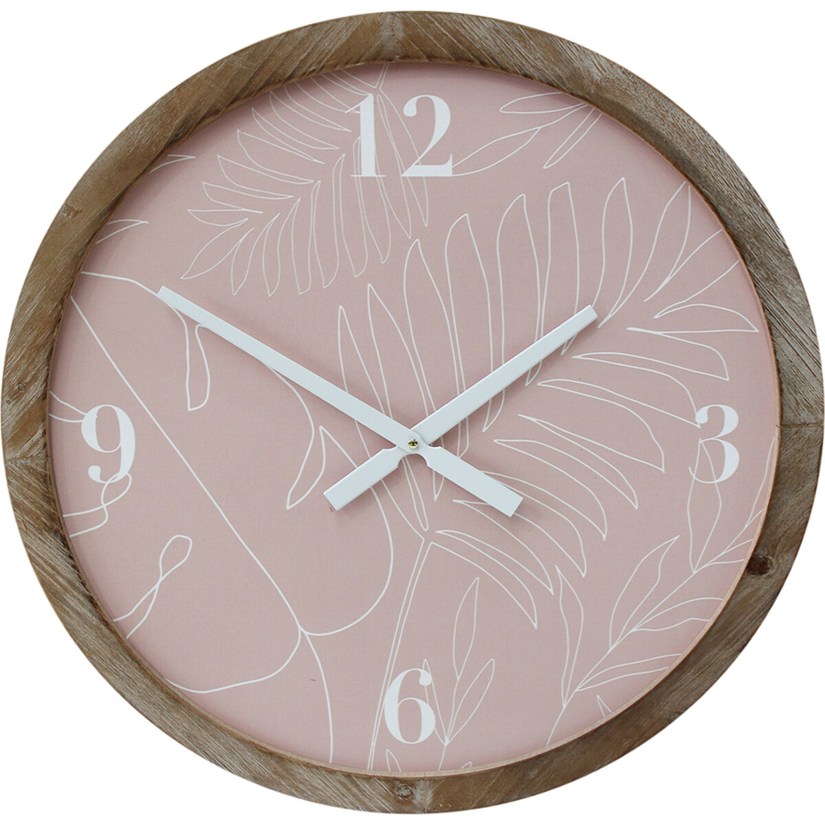 Made in a spherical shaped dimension which measures 60 centimetres in length, 60 centimetres in height and 3 centimetres in width, this Clock Peach Palm 60cm is both large and lovely given its material component through which such classically appealing wall clock is crafted. It is made through the use of specially engineered medium density fibreboard material with its interior painted in a peach hue while its edges is left in its natural brown colour with light white painting.