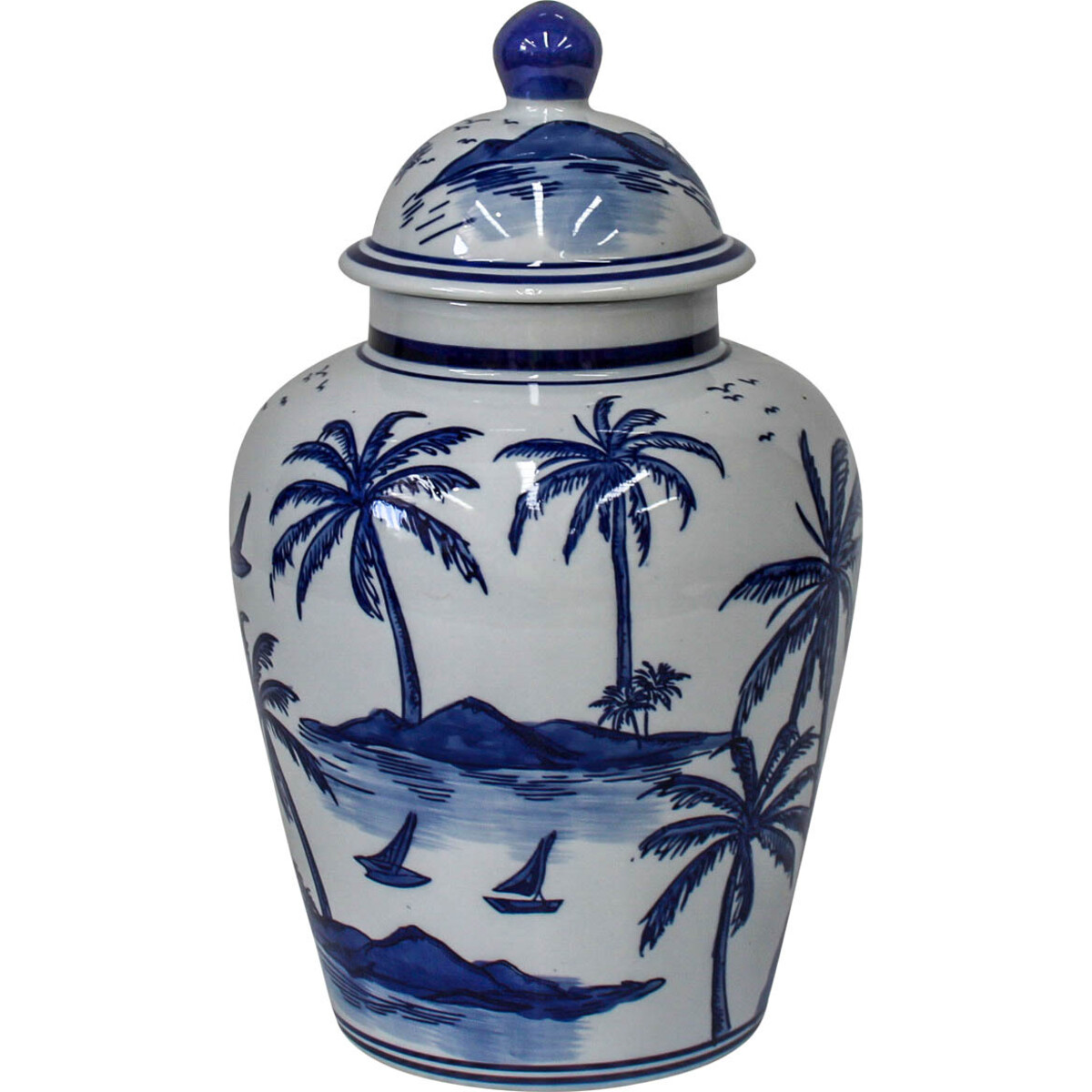Did you know that ginger jars were initially used in transporting precious spices such as ginger from China all the way to the West? When it got to the West, it naturally got its name from the spices which were contained inside, hence, 'ginger jars'. Today, however, they are no longer used for transporting precious spices any longer, but are precious decorative items and this particular Ginger Jar Blue Palm is a decorative masterpiece. It can be used in a variety of settings for a variety of decorative purposes. It all depends on your customers' decorative keenness. Please read the instruction about freighting this product or contact us for further information.