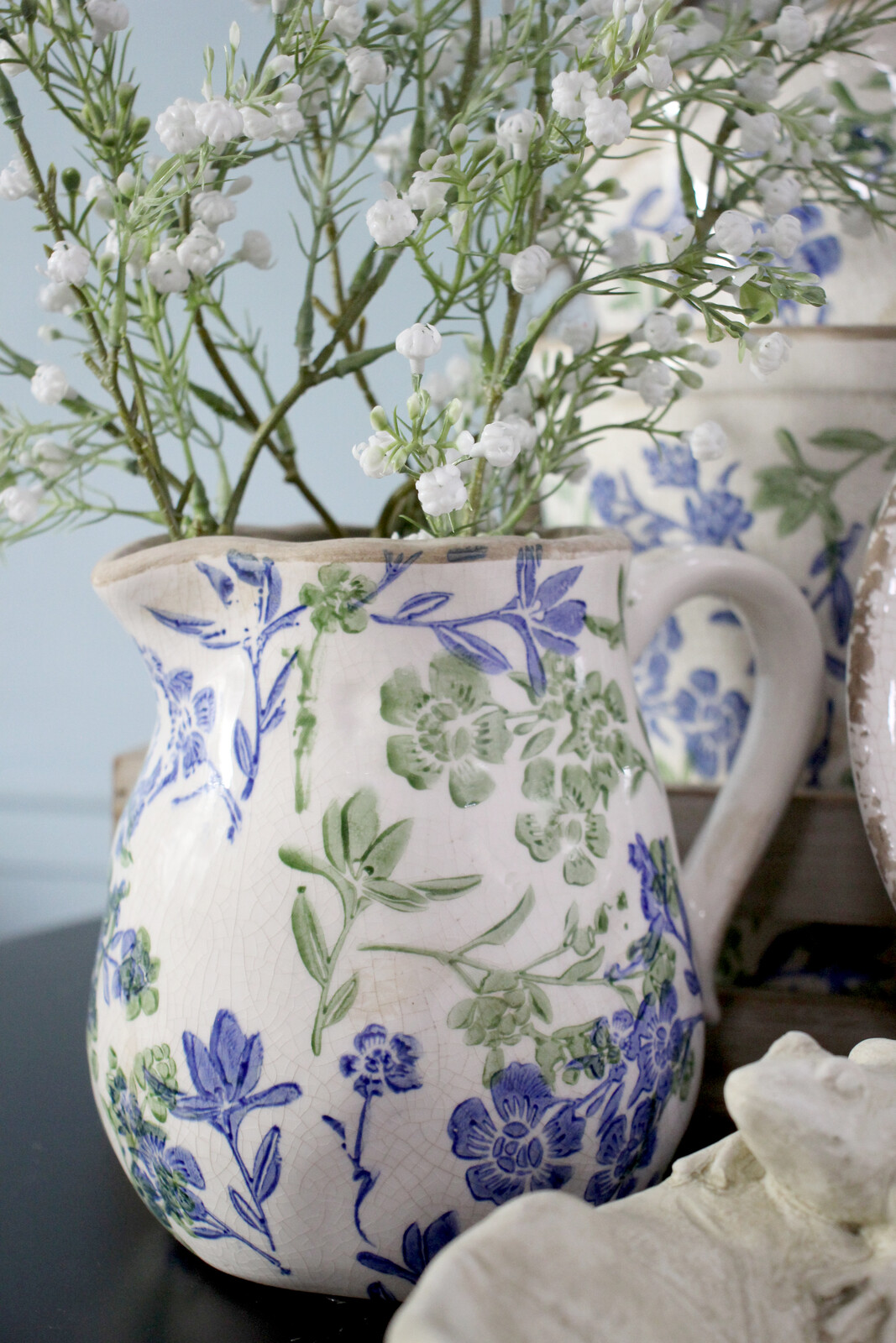 We’re always getting customers in the warehouse pointing this jug out - they’re drawn to the blues and greens, obviously, but they pick it up and see how solid it feels and that’s usually what gets them. Our Jug Botanical Blue Med isn’t a quick little flower vase or a props-only piece, it is a properly handcrafted item, generously sized at 16 by 13 by 15.5cm. We do notice how keen people are on its rustic finish with those slightly uneven lines and an ever-so-lovely, crackled ceramic look. It just feels like something you’d find in a French kitchen or on a tray for Mother’s Day breakfast.
