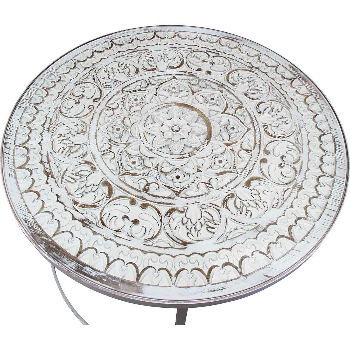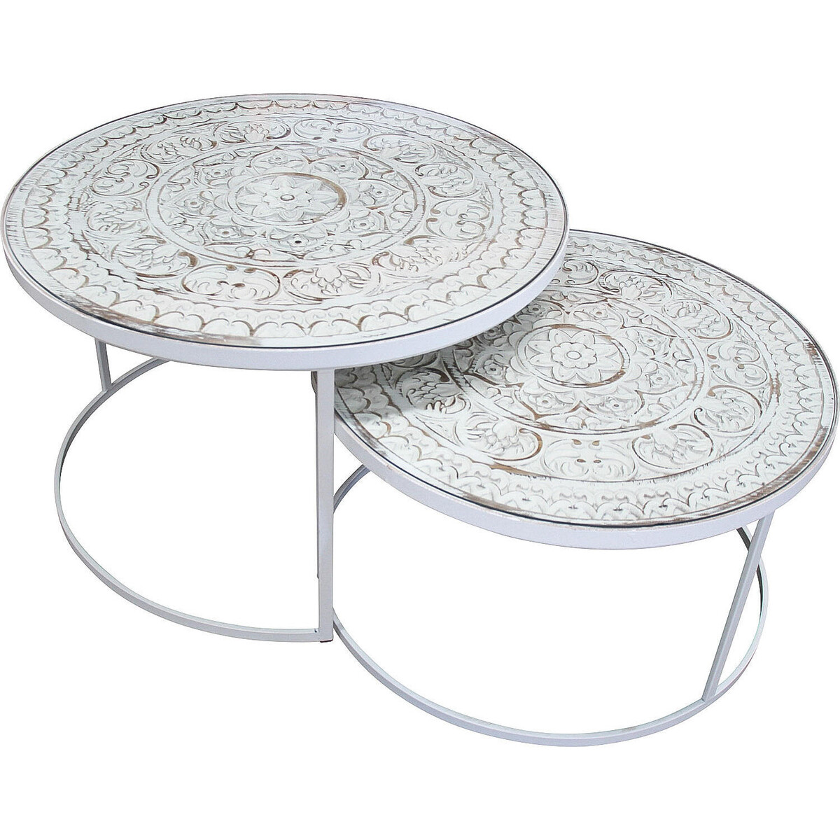 The table top has an ornate pattern that has been created on resin-covered in glass and the frame is made from metal giving it that sturdiness that adds to its usability in your home and interiors tables for many reasons is the responsible for the manner in which your spaces are utilized. This set has two tables in varying sizes.The white coloured metal frame at the base and the pattern ion top collaborate beautifully to create a perfect impression of shabby chic styling. The top is covered in glass allowing you to use it for all kinds of displays or for parking your books, coffee mugs or the lamp you wished to display. Sturdy metal gives it great balance and the ornate deign on top lends it elegant and classic kind of appeal. Extend your seating saces and lend your d?ɩcor that much needed class and elegance with the inclusion of this set of round tables. Will blend in well with modern shabby chic styling as much as with more traditional settings. The round tables are covered in glass through which you can see the utterly charming pattern -the white colour wash of the top matches with the white painted round metal made base. The sturdy top has been fabricated from wood and given a resin made pattern that resounds with your love for things ornate.
