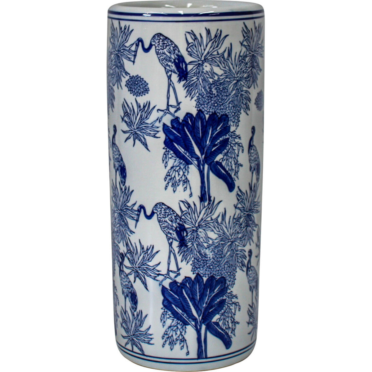 Did you know that the wing of some species of Storks is over ten feet long? That's twice the height of some people. These tall birds are majestic which is why this Umbrella Holder Blue Stork has a decorative, majestic look also. This umbrella exhibits a stork motif through its elegant painting of tall stork birds. It featured a repetitive pattern of two stork birds walking amidst a little patch of plants. One has its neck bent in search of food while the second is on the lookout for possible danger. It would be a stylish way to keep your umbrella against future use. Customers can place it on the fireplace mantle for decorative as well as drying wet umbrellas. Please note that due to its precious porcelain material, this product is freighted only with a full pallet order. You may contact us for further information.