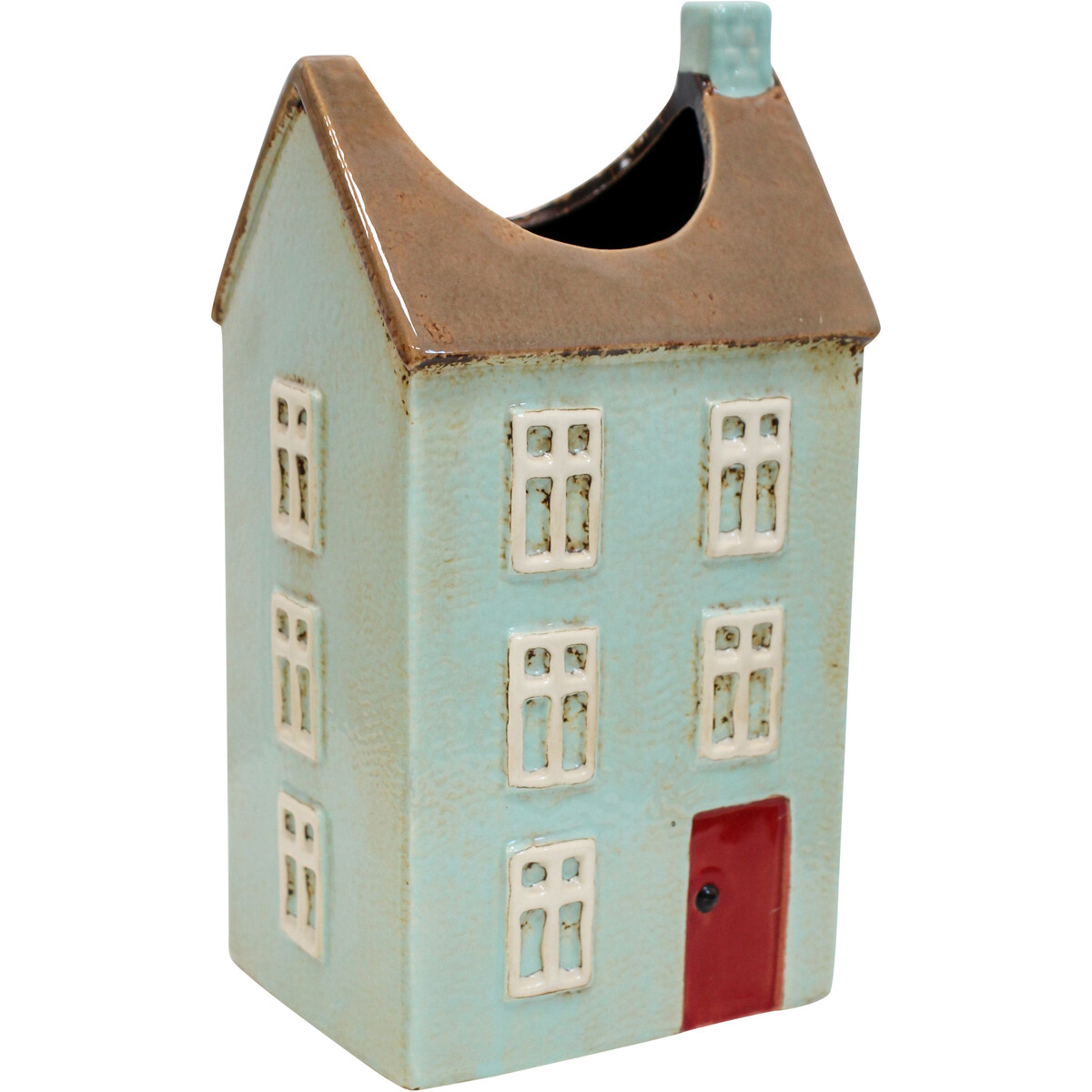 The Planter Village House Aqua features a tall ceramic mould that is made in the motif of a beach house. The house is made as a three storey mansion that contains a total of 5 rooms which can be deduced from its total number of windows marked in dimmed white hue. The entrance to the house is a red painted door which has a black knob. The roof is painted in a white washed cinnamon brown colour. There are a dozen of this aqua blue painted planters in every carton that your order today.