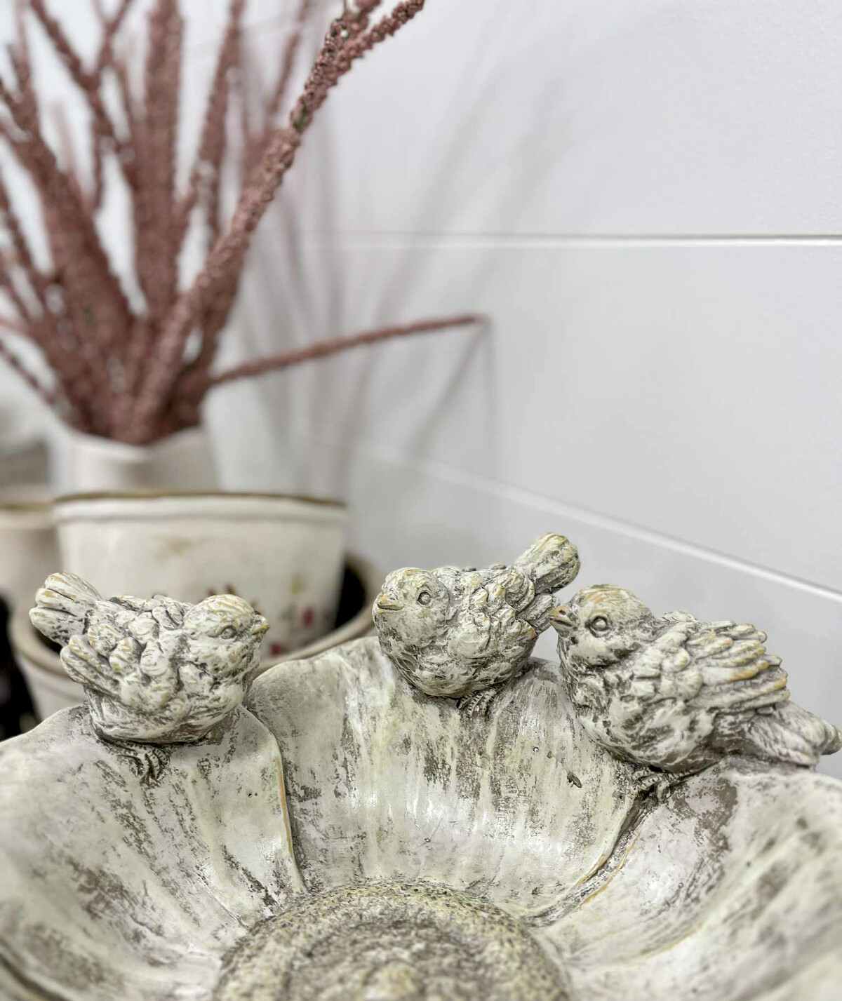 It’ll sit comfortably in most gardens, patios, or even on a larger balcony table as a statement piece. Subtle colour means it can easily blend into different decor themes – country home, modern Australian bushland, classic English cottage, anywhere really. The three birds perched on the rim are lovely - they invite the imagination to wander. Fill with water for feathered visitors or drop in some pebbles and succulents for year-round texture and visual interest indoors or out. Whether as a bird bath or table centrepiece, there’s genuine versatility in this one - it feels solid (literally) and genuine in any outdoor setting or even in a home full of plants and natural textures inside too.