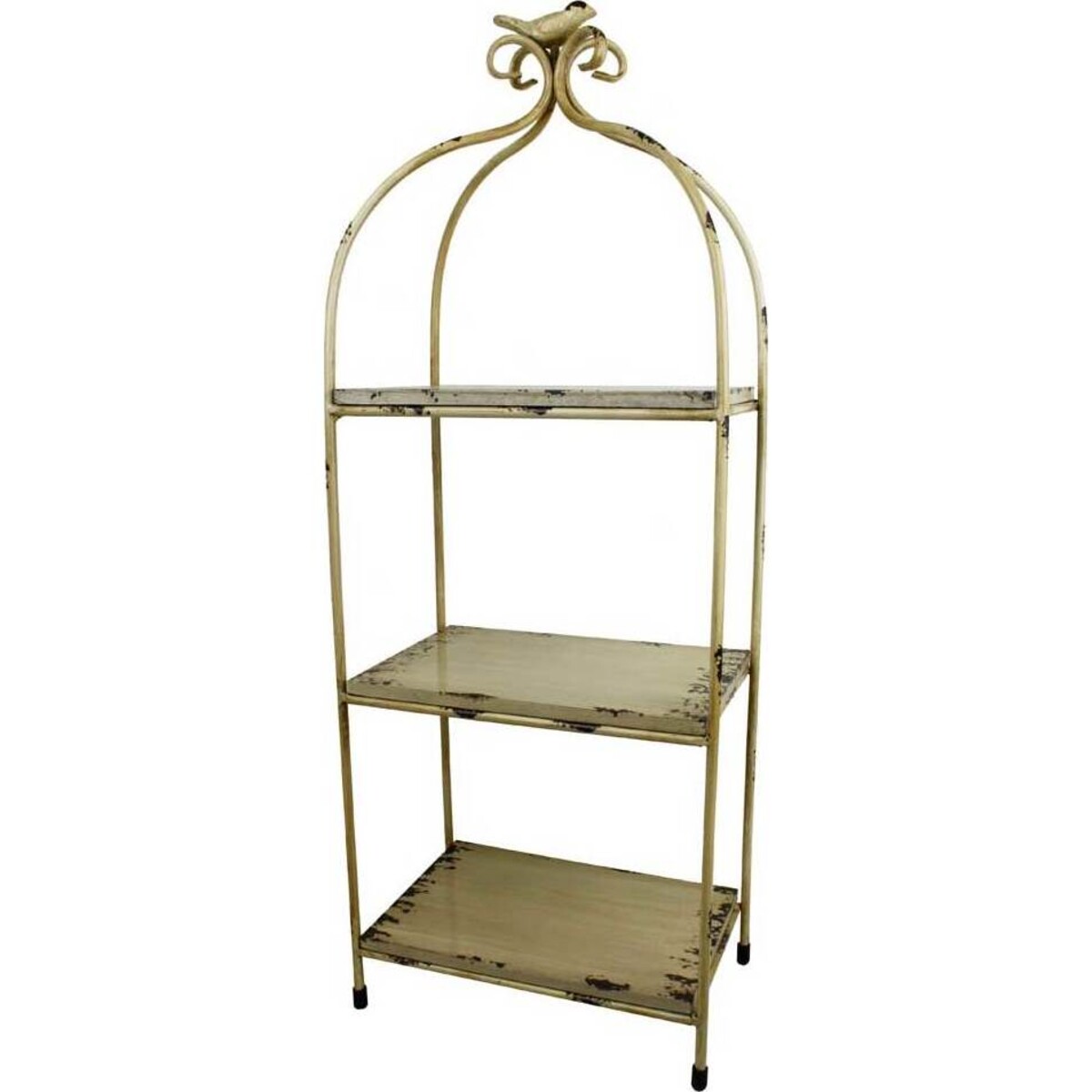 Furniture add-ons always must try and comply with the general nature of the theme and if its old world classic or shabby chic that one is hooked to-this three tiered crowned shelved piece is the answer to some serious room makeover. About 3 feet in height, the shelves rectangular in shape with 20 cm by 24 cm dimensions makes this a perfect little piece to snuggle into the interior if one wants to add that little special bit of vintage feel to the décor. Sturdy and strong this tiered table will look fabulous on the living room with lamps, books or planters and little curious nestled amidst them all. It could well become that little heaven for all things precious that one hordes for one’s home. The top of the table is made with the arched iron frame on which is a little bird adding that look of a wonderland.