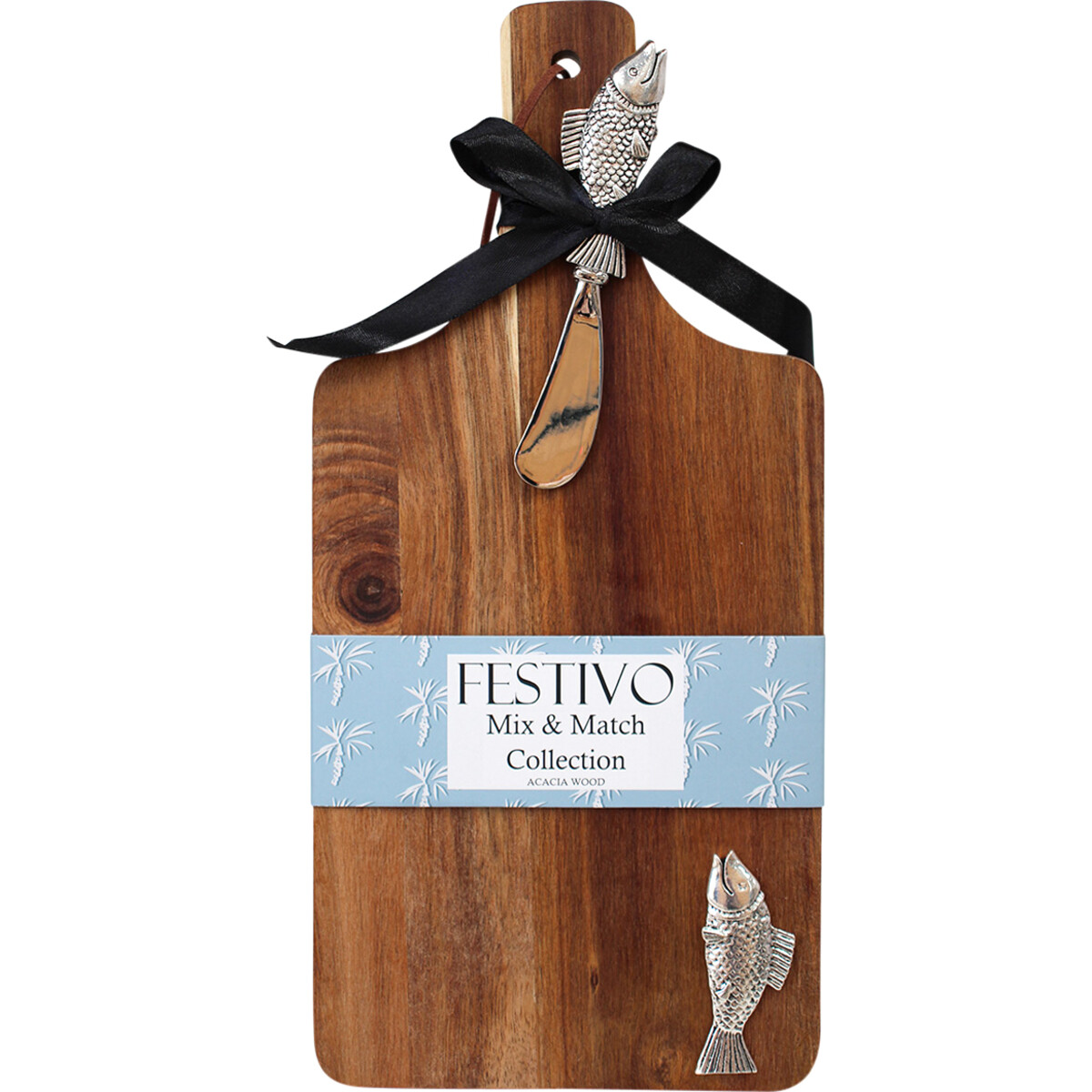 Crafted and decorated with a fish motif, the Acacia Board & Spreader Fish is prepped and ready to b sold as a suitable gift item that can be presented to anybody such as family, friends and colleagues. But, this will also include all who are chefs or have a knack for cooking. It would be a perfect gift item to gift to one's host/hostess as a "thank you" gift before or after a dinner party is over. Both the board and spreader are ornamented using silver coated metallic fish figurines.
