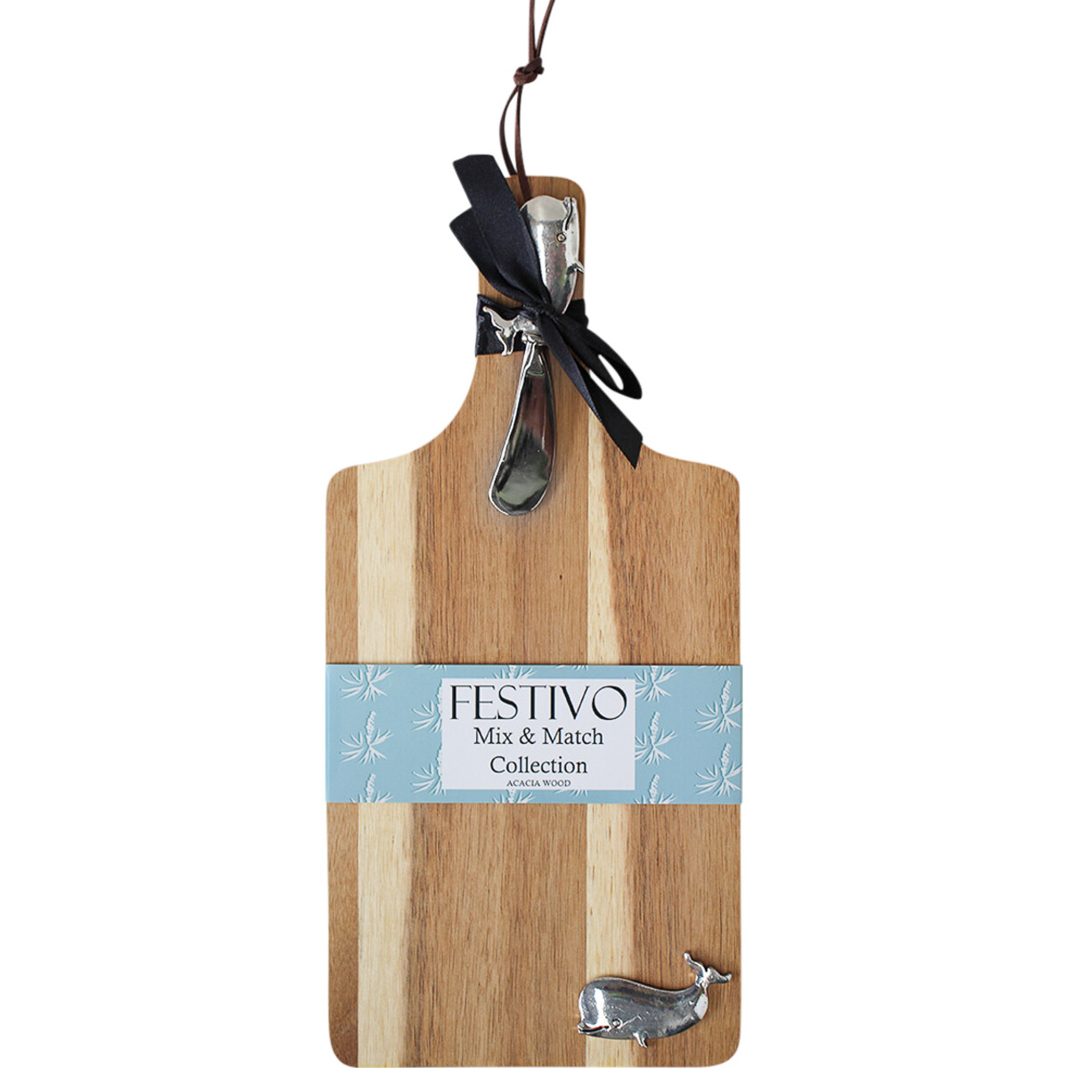 Whales are perhaps the most incredible animal that lives within our oceans. These mammals could grow to such gigantic size and weigh so much. In fact, the blue whale is the largest animal both on land and in the water known to man to have ever lived. It is this graceful beast of the seas that ornately decorates the handle of the metallic spreader which comes with this acacia wooden board. Even the board is also ornamented with a small whale figurine attached to one side on the board's surface area.