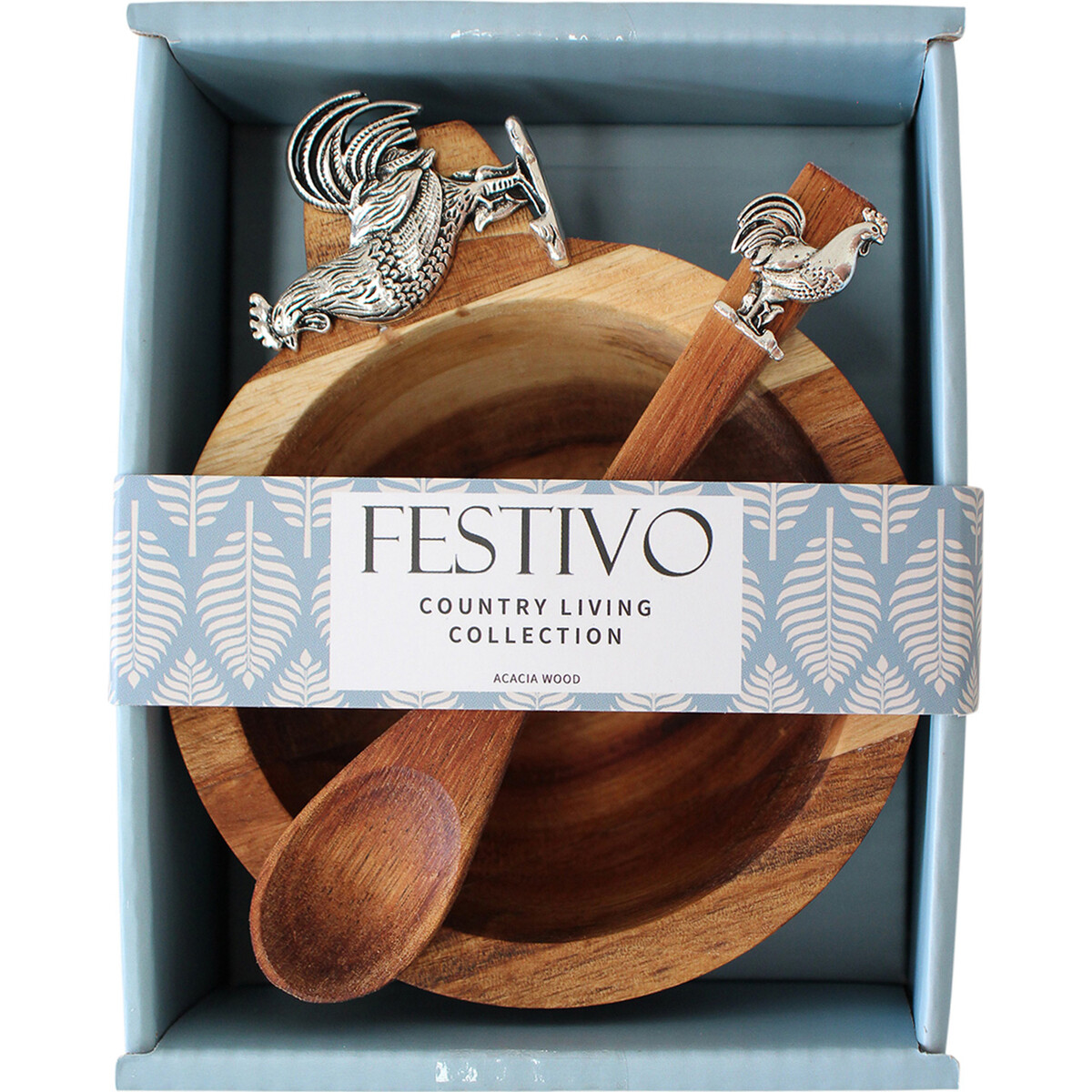 The Acacia Bowl and Spoon Set Rooster is the perfect way to enjoy a similitude of country lifestyle especially with regards to the kitchen and dining room. Both the wide bowl and the included spoon are both made of carefully selected organic acacia tree. Both serving wares have an appealing aesthetic outlook especially given its all natural, wooden brown palette. At the base of the spoon's handle is a silver coated metallic rooster which stands tall and proud. The bowl equally has a similar ornamentation on its handle also.