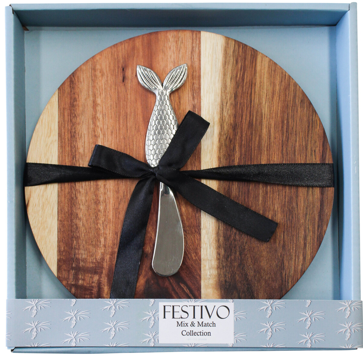 Acacia Round Board/Spreader Whale is a unique and stylish product that is guaranteed to enthral one's guests. It makes a statement at casual diners with friends or after-dinner treats or outdoor picnics. Dull rounded edges, whale-inspired design, metal ornamental detailing, and appealing patterns characterize this spreader. Because of the longevity properties of acacia, cuts from a knife or smashing do not affect the board. The metal spreader is designed to make scooping and spreading honey, butter, and jam effortless. Plus, one can use it to spread soft creamy cheese.
