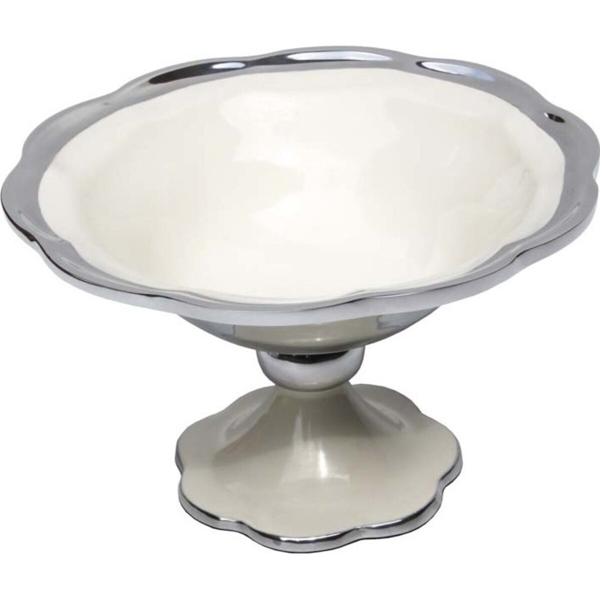 Still featuring the endearing elements of LaVida's Al En servingware line, such as the creamy white base and the silver scallop edge, standing on a similar scallop-edged foot, this cake stand nevertheless has its own "character." It can hold a medium-sized cake, cheesecake or pie. It works better in smaller, intimate settings than in large, grander ones, where only loved ones or close family members are in attendance. A candle-lit setting would not hurt. It can also work well as a small table's centerpiece. Whether you're serving appetizers or an exquisite dessert, this cake stand is an appropriate pedestal that will bring out the beauty of the baked culinary delight.
