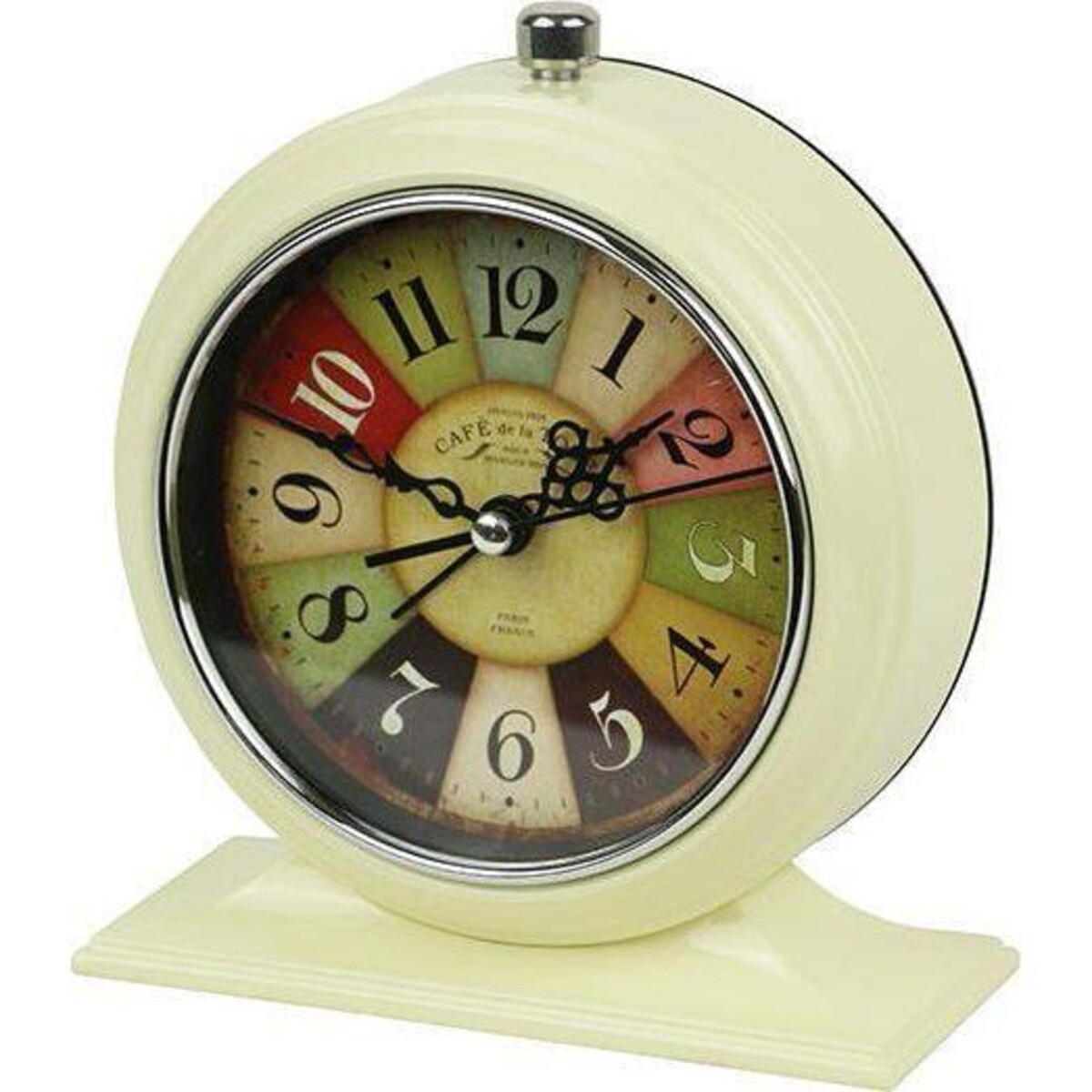 Adding a clock to your space seldom makes sucha huge impact to the look as it is basically a utilitarian article meant to wake you up on time with its stark buzzing sound. Not in the case of this gorgeously designed cream coloured vintage table clock that has the face resembling like casino roulette and looks fabulously old word and very chic in all its completeness. Here is the quintessential table clock that has a well balanced solid structure. The face of the clock is round with a multi coloured roulette design on which is printed the name of a French caf?© that lends more cool quotient to its looks. A clock that seems steeped in the past, yet much abreast with the times when it comes to the quartz technology. Place this 12 cm high cream rimmed clock on the bedside, the mantle or the study table and be assured that you will always be right on time!