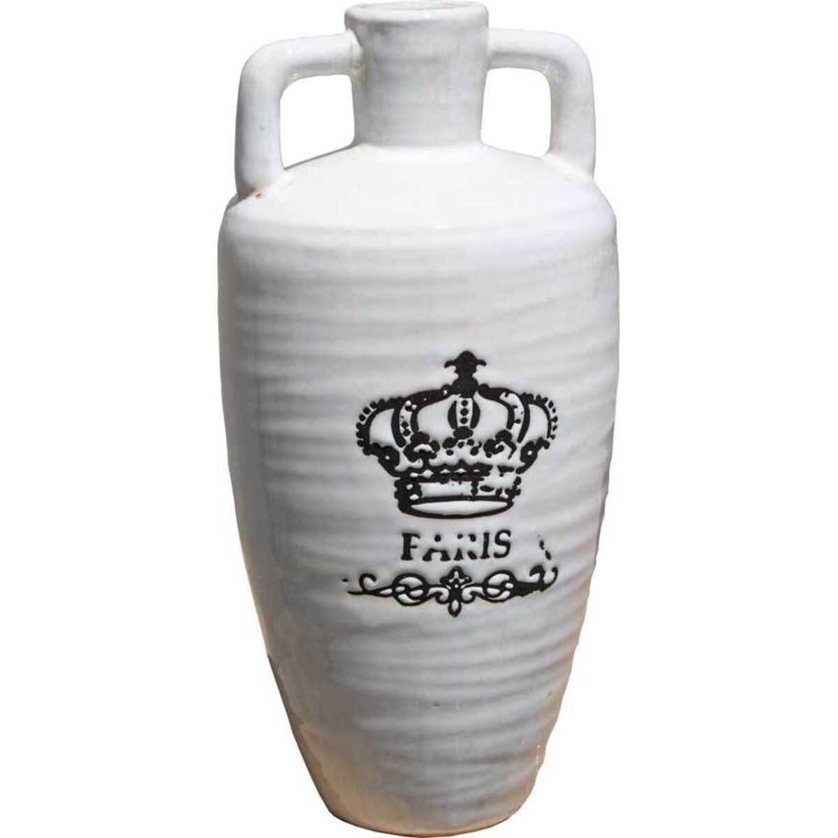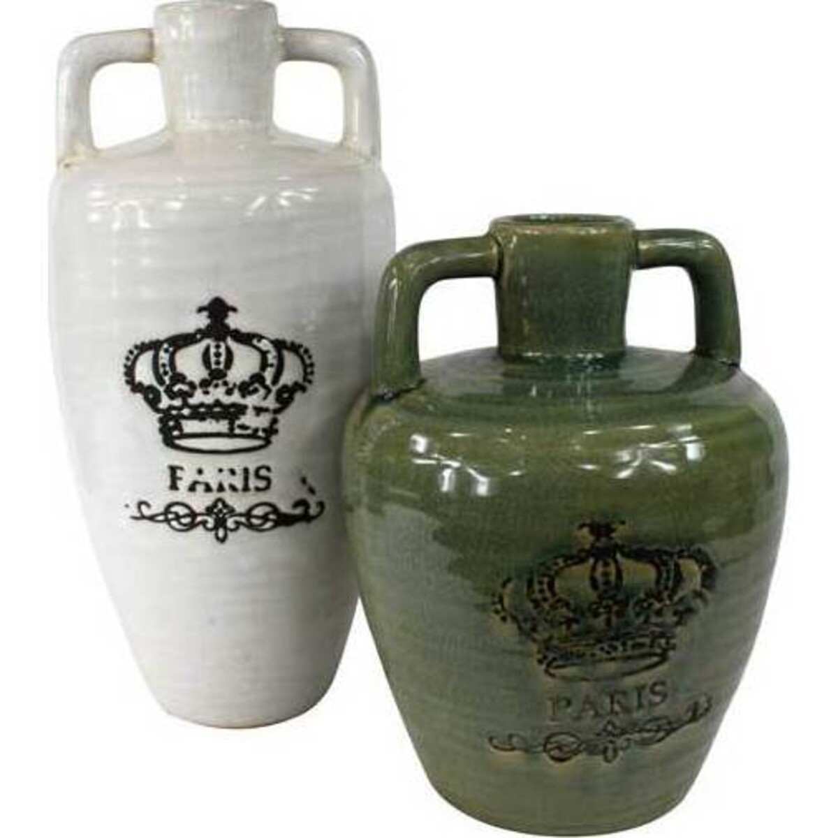 The green jug features a cracked appearance to give it an illusion of being around for years. At its center is a black crown with "Paris" stamped underneath. A final black line flourish pulls everything together, and a lid at the top of this accent makes it easy to use in a variety of ways. Use it to store a collection of small items, such as scarves or shells, use it as a cookie jar, or take off the lid and use it as a vase. Regardless of how you choose to use this jug, you're going to love having it in your home.