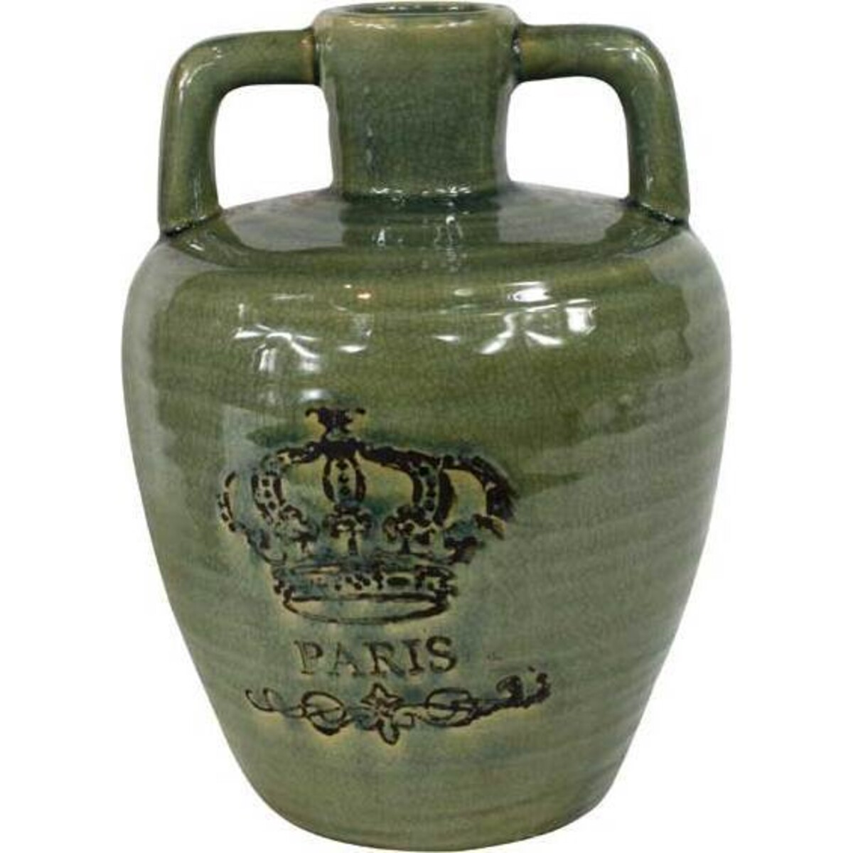 This lovely piece is moss green in colour, and features a black crown design on the front with "Paris" stamped underneath. Below is an elegant scrolled design that adds the perfect finishing touch. A glaze finish adds a little bit of shine while two handles at the top of the jug make this piece easy to transport. Use it indoors or out and it will complement your home beautifully. Leave it as is or fill it with flowers, but however you use it, it's sure to be one of your new favourite decorative accents in your home.