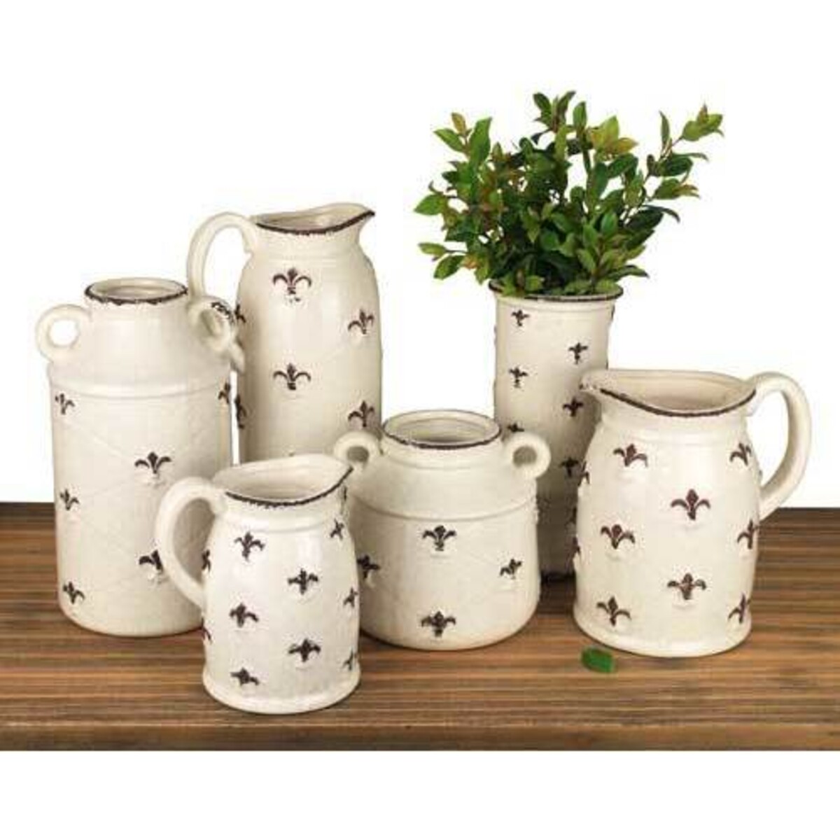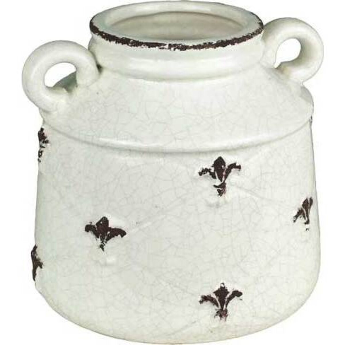 These fabulous pieces are off-white in colour and feature a dark fleur de lis pattern all along the base. Around the mouth is darkening for an added touch of detail, and from top to bottom you'll notice a crackle pattern that gives these items a final flourish. Two small handles on either side allow these amphoras to be easily transported from one location to the next. While they can be used as decorative accents, you can also use them for a variety of other purses such as a planter for small plants.