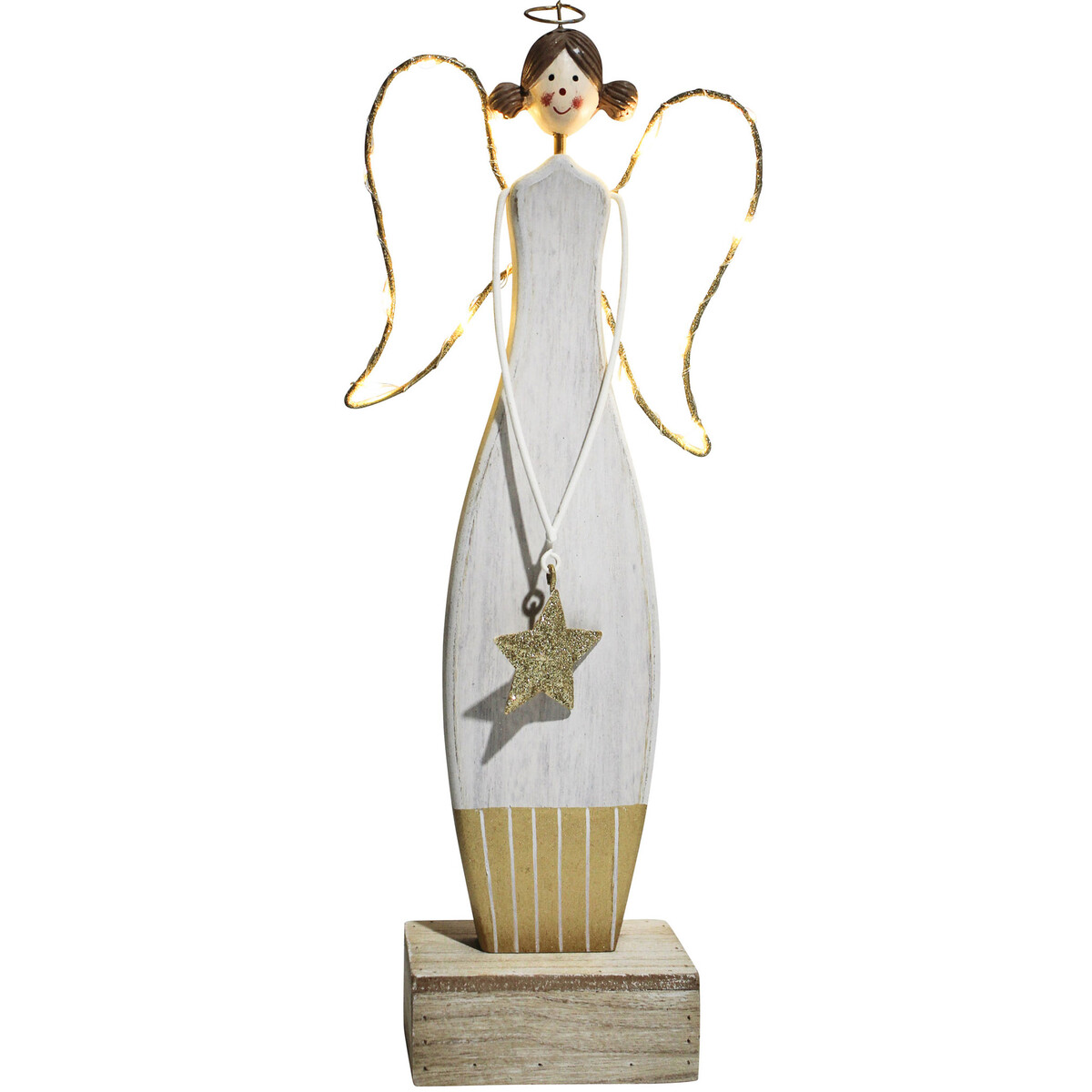 Showcasing fine quality metal crafting along with the use of specially engineered medium density fibreboard material, the Angel Delight showcases the figurine of an angel in tandem with one of the numerous symbolic decorations and representations of Christmas. The square shaped base of the angel is made using medium density fibreboard. Over this stands a pretty smiling female angel made through the use of metal with hands made through the use of ropes at the end of which dangles a sequined star ornament. The angel also has two wings which are illuminated by LED bulbs powered by 2 AA batteries.