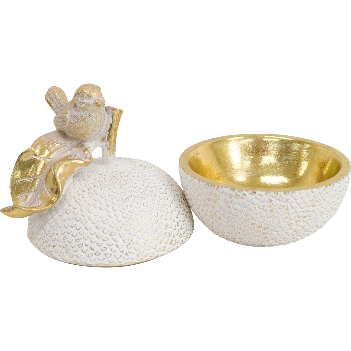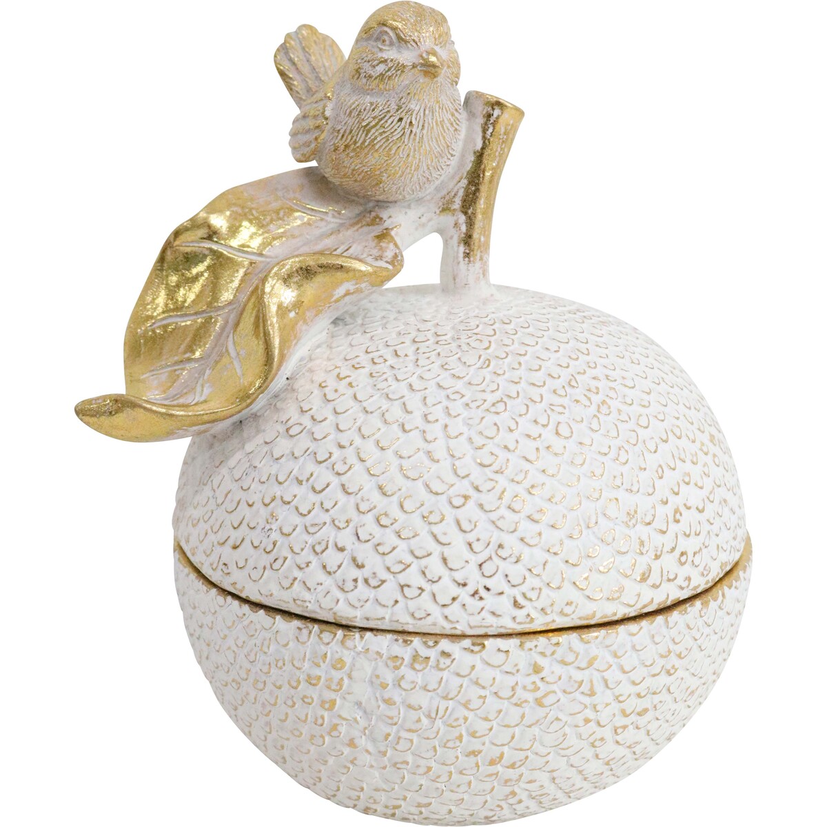 This Apple Box is one of those little pieces that manages to be - well, quite a bit more than just decorative storage. We can imagine it making itself useful as a catch-all in the lounge room, holding keepsakes or trinkets on a hallway console, or even bringing a bit of warmth to an office desk. With its gold-leafed interior and white, textured exterior (love that vintage-inspired look), the surprise detail is really what steals the show - a bird perched atop, softly finished with golden highlights and a leafy branch.