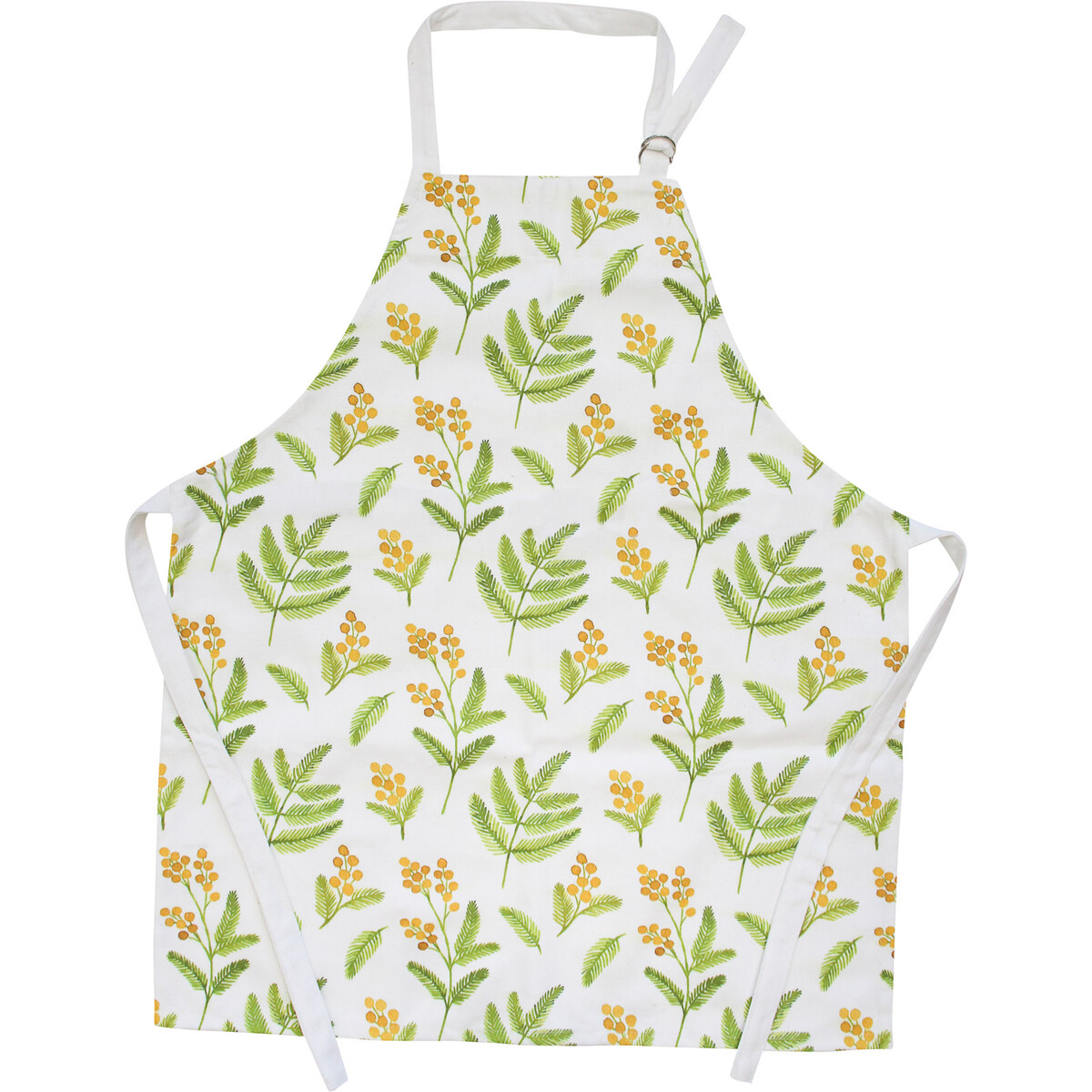 The Apron Mimosa is the perfect apron which would accurately reflect the elegant personality and preference of the users. The apron is made in a dimension which measures 68 centimetres in length and 80 centimetres in width. This makes it perfect for use by small and average sized persons as it would appeal to chefs, hosts, hostesses and even restaurant attendants. The front part of this apron is ornamented by the use of the enigmatic sleeping tree – the mimosa plant which is artfully depicted using bright colours of mint green and orange hue over a pristine white background.