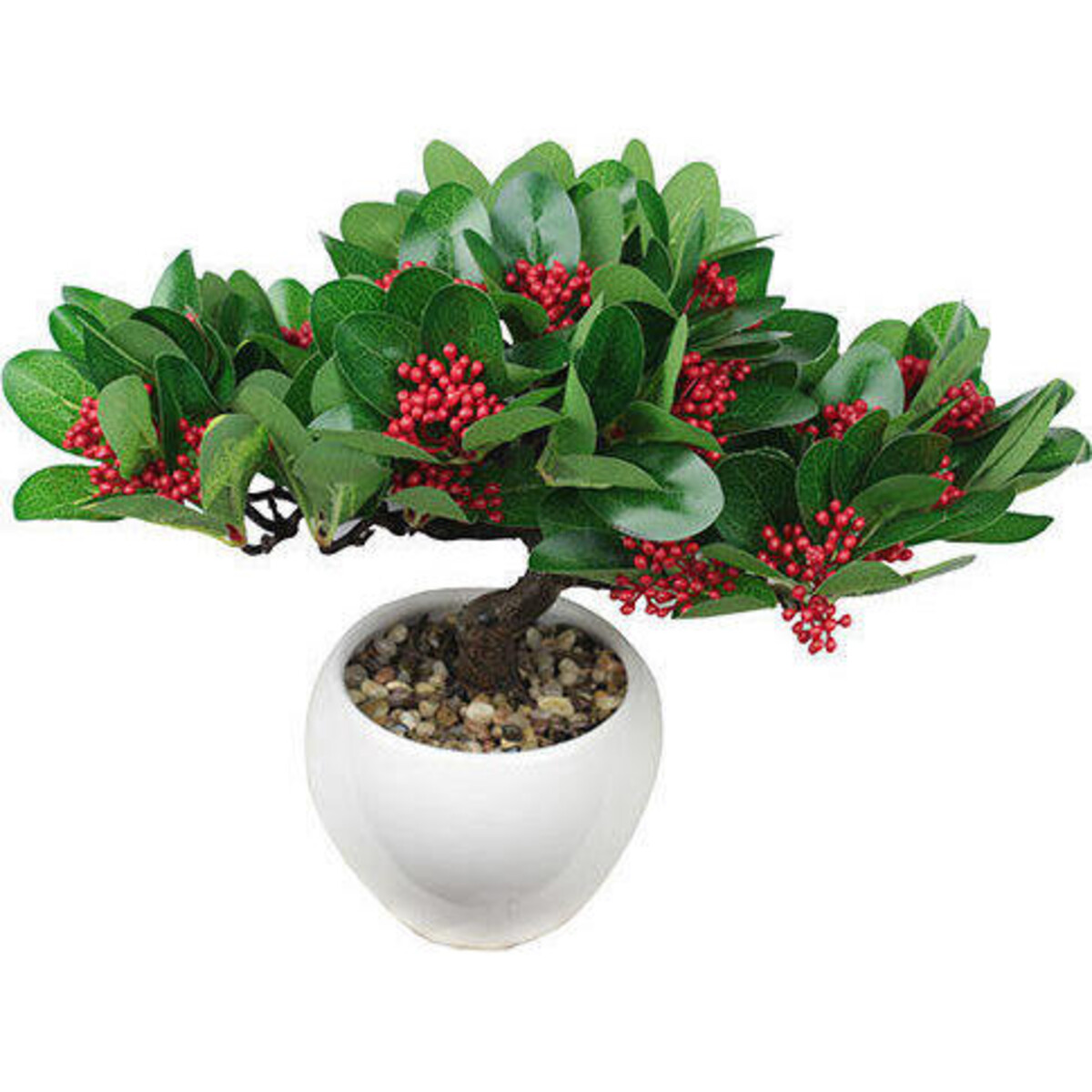 Make nature play its most important role in your interiors buy creating a stupendous ambiance of immense beauty. Plants lend spaces a serenity - a calmness and a wonderful backdrop to offset any other kind of décor. Add a bonsai such as this to corners, consoles, shelves or even the dinner table and make it count towards adding a touch of green gorgeousness all around. Made from plastic and foam, the supple shiny waxen leaves and the perfectly replicated bunches of berries, the perfectly formed fronds of leaves and the pebbles strewn at the base of the main trunk jutting out as if from the soil - are all details that makes this plant the most believable, almost real in look. The rounded dense green leaves, the spanning out branches as if reaching for more moisture laden air and the beautifully created gnarled branches are all stellar in quality. A simple wipe with a damp cloth is all it should take to keep it looking fresh and dewy.