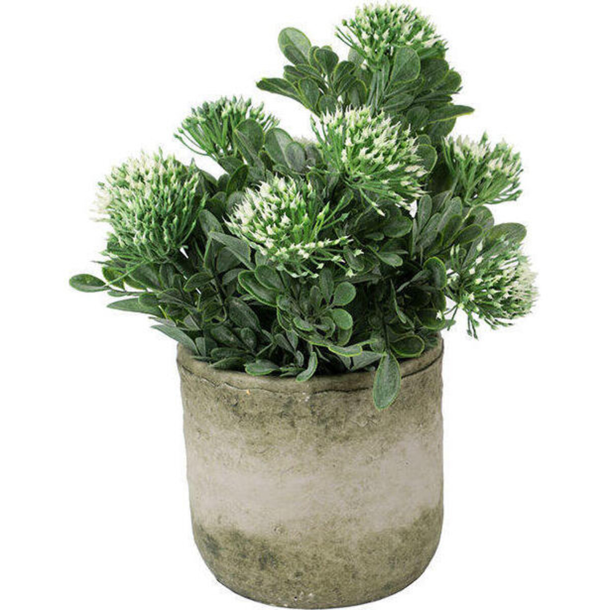 The bushy look of this plant stuns you with its natural feel. Some fronds and stems seem shorter, as most plants are never perfect in their stem sizes - each bunch of flowers with its own personality, and each leaf having its own structure and life. The colours of the blooms a soft white highlighted all the more by the deep green of the waxen leaves. Here is a stunning replica of natural flowering plant which will make all the difference to the way your décor looks. The rustic feel discoloured clay planter in a dull grey adds a touch of realism to its otherwise plastic features. The foam setting in the urn makes the springiness of the plant count towards making its overall feel and touch all the more real. The plastic used and the colours chosen for the leaves and the flowers are correctly balanced in term f tonality and the very fact that even in plastic such real - life replication is possible, makes it worthy of your indoors. While the season brings a cover ow white all around, let your indoors revel in the beauty of Spring despite the change.