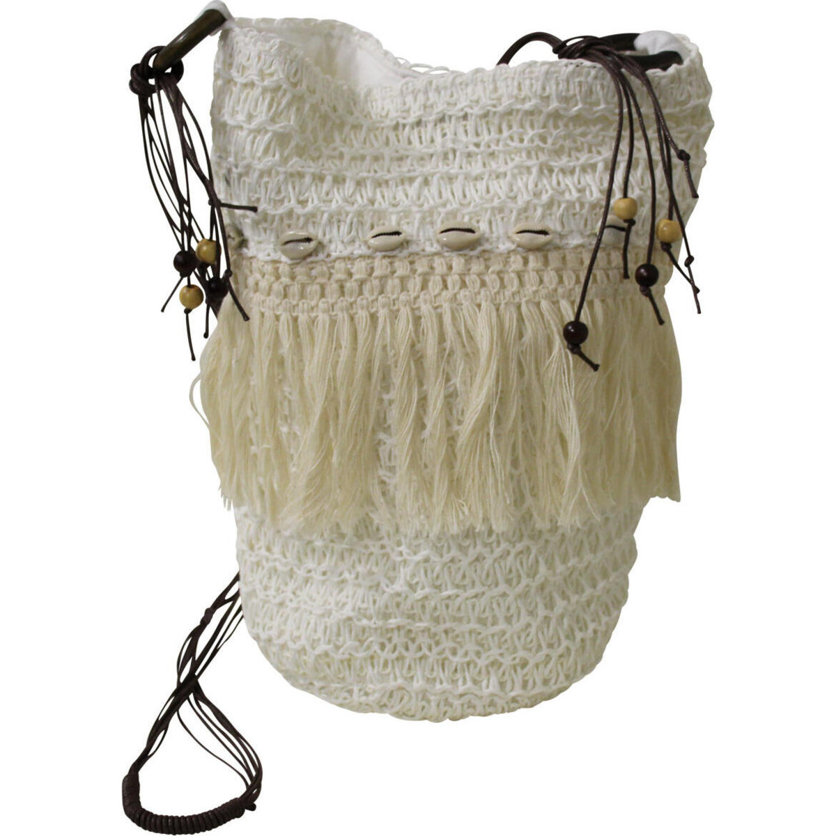 Bringing alive the chicness of things bohemian can best be encapsulated in designs such as this. All white, fringed in white lace and embellished with more white- in the form of corrie shells-there is a fresh, summery frothy appeal in a bag of this nature that is seamless in shape and kind of destructured to give it a tub like look.