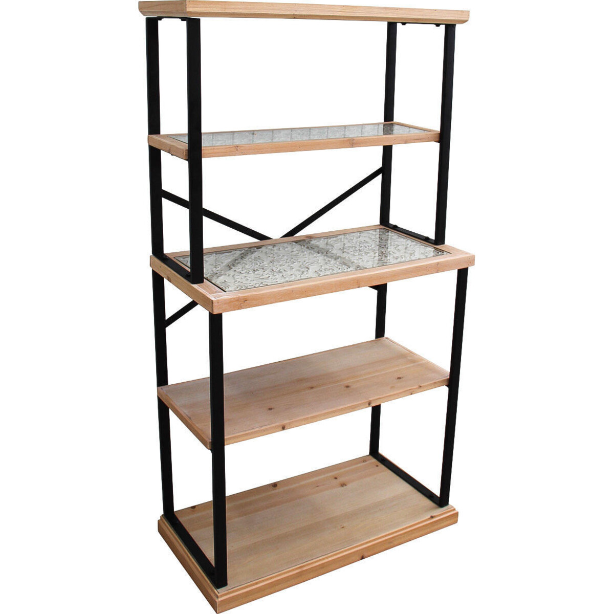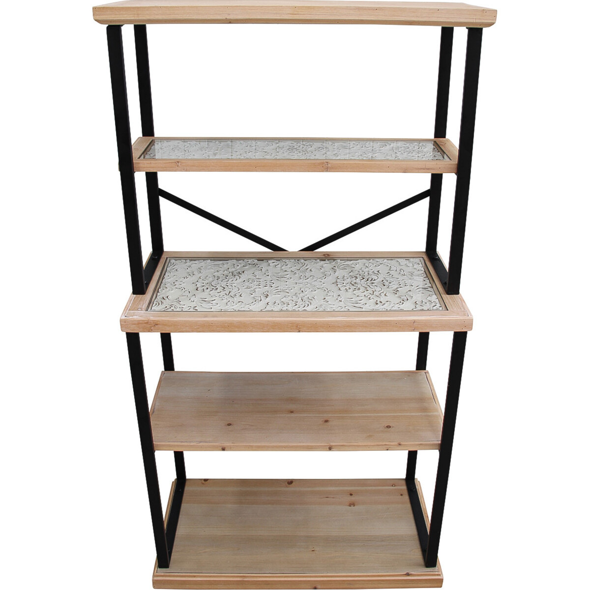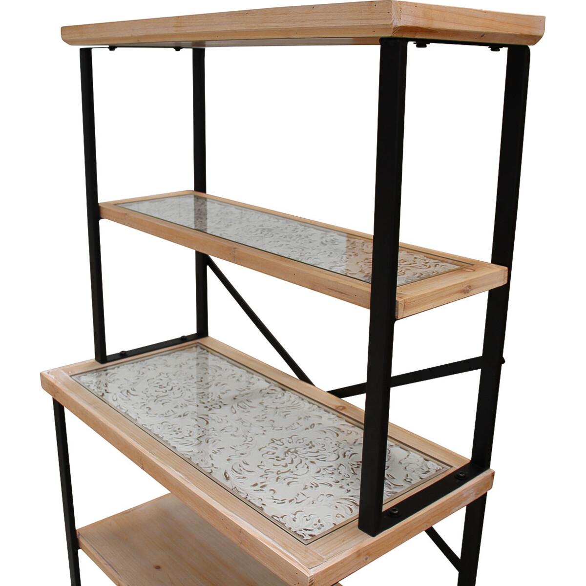 The shelves are many-some detailed and beautifully embellished in resin made design topped with glass-the wash of white colour adding to its modern classical chicness while the iron grid that forms the frame lends it a modern utilitarian look, the sturdy well balanced design show cases the best in design, the top portion of the unit being narrower than the lower shelves. This ads to the width of shelf space in the lower portions that are closer to reach. It is in subtle design aesthetics that Lavida brings out the quality and finesse that its products bear. The perfect choice for your dining room if you an avid baker, or for a confectionary parlour- and for all homes that like to create ample space for jars, containers alongside displays of family pictures and the likes. Made from high quality timber and resin pattern on several of its shelves, it's a delightfully conceptualized shelf unit for all kinds of needs.