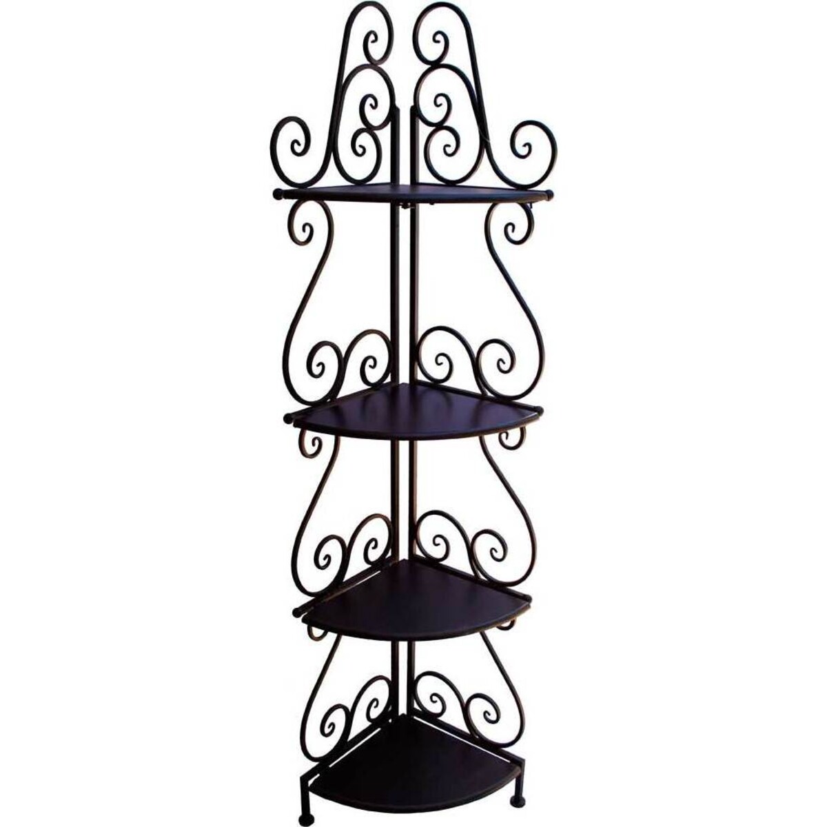 LaVida's Bakers Stand Provence Corner L offers storage and display possibilities in previously unused space. Tucked into a corner, this four - shelf bakers stand keeps kitchen essentials, books or other items close at hand. Crafted from black metal accented with scrolls, this stand adds elegant style to any room of the home.