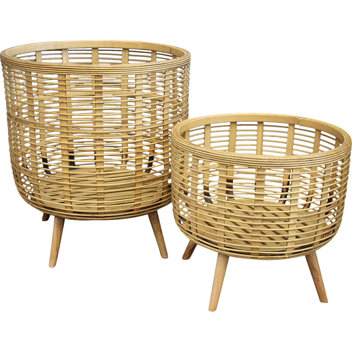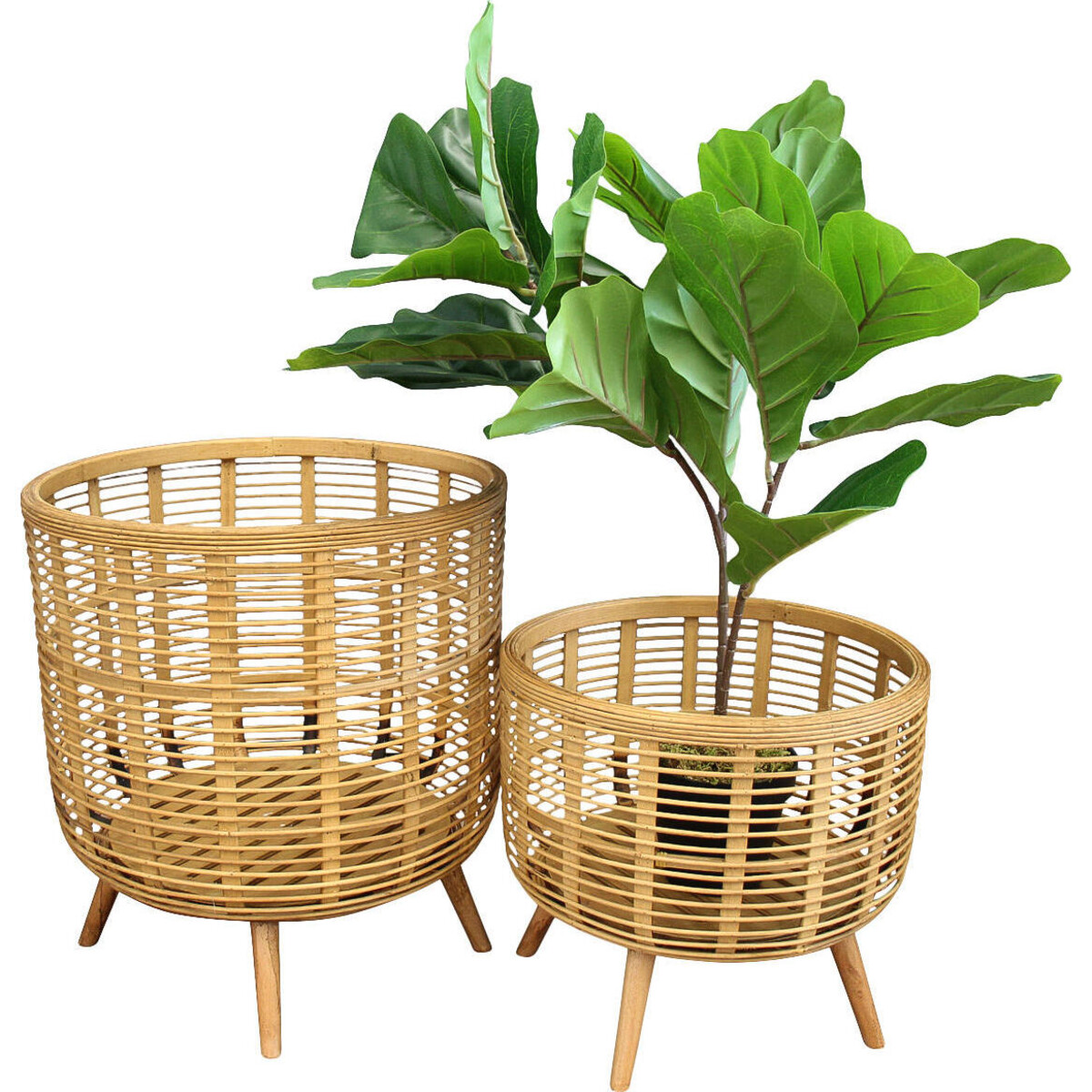 Enhance your store's home decor collection with the Bamboo Planter Set of 2 in Natural, a perfect blend of natural style and modern design. Crafted from eco-friendly bamboo with metal accents and fir wood legs, the large planter measures 39.5x39.5x44cm while the smaller companion is 34x34x31cm. These planters' airy, woven construction and warm tone will appeal to customers looking to bring a touch of organic elegance to their indoor or outdoor spaces.