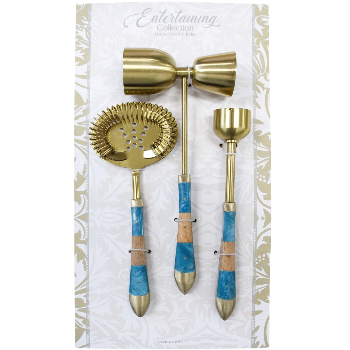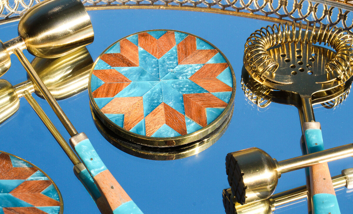 If we’re being honest, our Bar Mykonos Set (3pc) is probably about as close as anyone can get to the perfect blend of elegance, utility, and just plain fun. Crafted by hand from stainless steel, brass, and resin, it’s a little bit Greek island with its geometric blue-and-wood inlay - but not so themed that it couldn’t sit in an ultra-modern bar or a classic home drinks trolley. The set includes three pieces - A: 18.5x3x3.5cm, B: 21x9x4cm, C: 19x7.5x2cm. Each feels like a true original. Because they are - handcrafted and finished by talented artisans who know what they’re doing. You’ll notice variations in colour and finish, little marks of individuality that make each set unique. This is part of the beauty of buying truly handmade pieces for a shop floor or showroom.