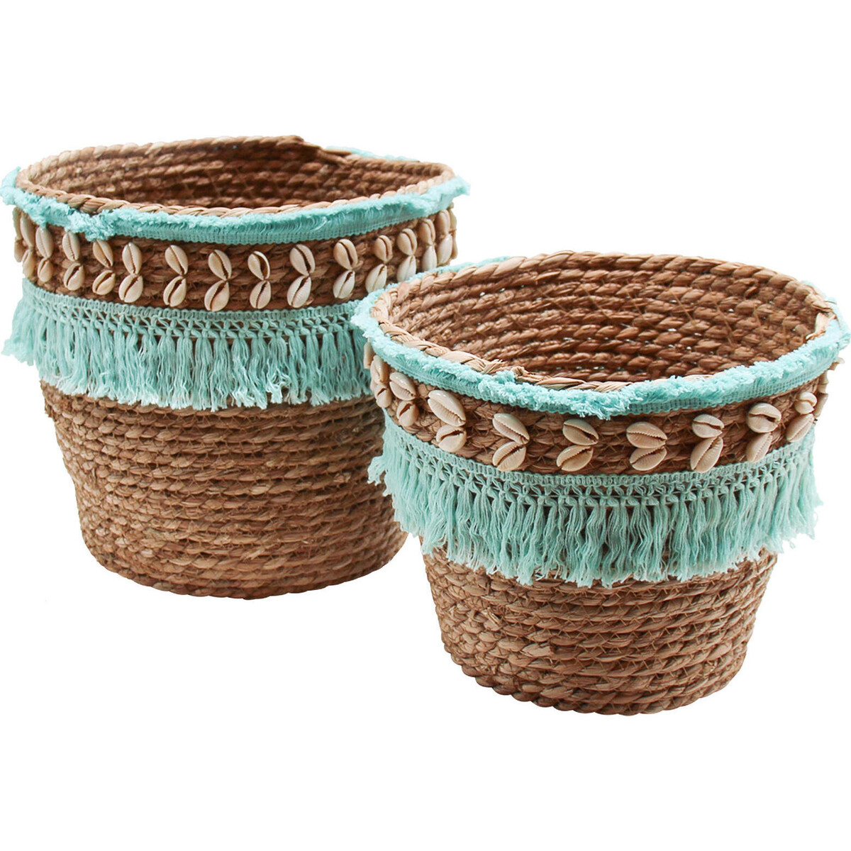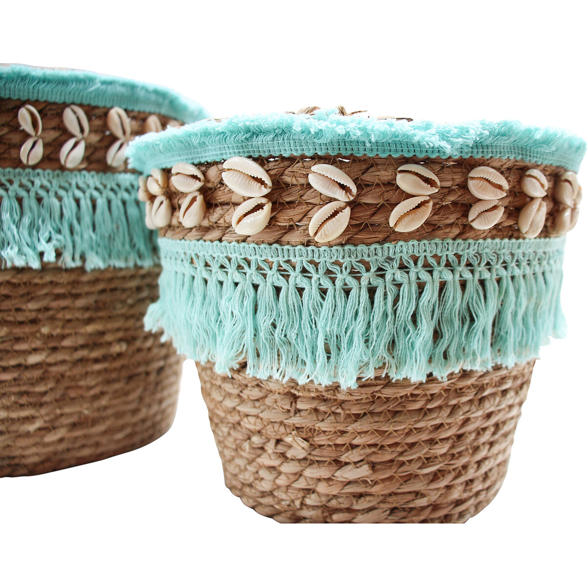 Make your spaces thrive on being better organized by adding storage options that come in handy for all sorts of articles of your sue-could be the extra greens you picked from your kitchen garden -the extra pencils and crayons on your child's study desk, or the extra soaps and lotions that you need to put away till you need the next refill. There is always a space to keep all of this and placing an onus on making things look prettier while at work are these stunning looking handmade baskets. They are created by expert hands that are great at reviving the beauty of ancient weaves. Topped by a fringe and lace addition they look all the prettier with the pop of colour the trim brings on the other wise organic beige colour. They would also look superb if used as display planters in which you could place some of your potted greens. The shell embellishments add a touch of beachy charm to its already graceful look.