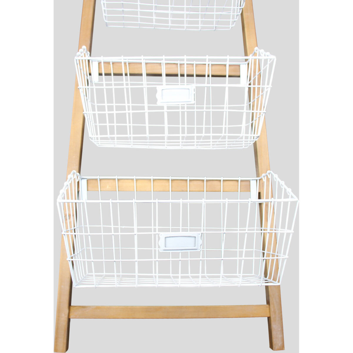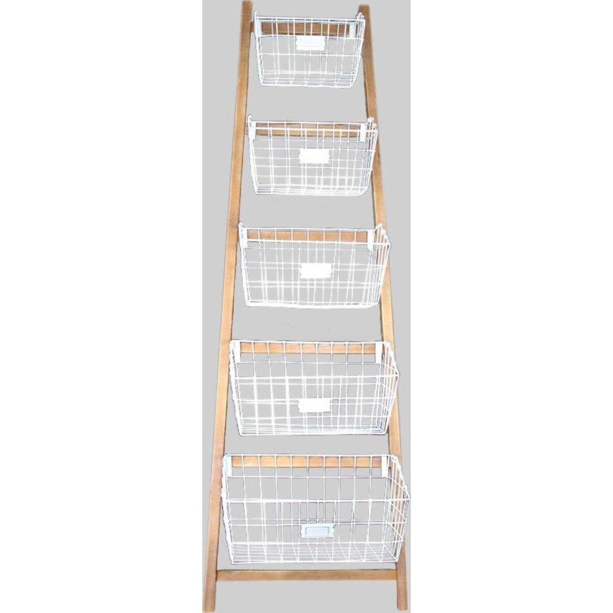 Be it your utility area at home, whether you stock and store your home essentials from grocery to washing detergents and the likes or in the children?s room where books and toys, clean clothes and stationery -all of them jostle for space-there is always need for smart organizers such as this ladder style multi basket type. Made of sturdy materials, it has six baskets in varying sizes -with the smallest on top to the largest one at the base. The ladder baskets are white in colour, made of wired mesh and have large deep compartments making their utility a critical part of their use in your home. Be it your bathroom, the children?s room or your own bedroom or kitchen, there is always that need for segregating different kinds of articles so as to make them easy to find and access. The sturdy wooden frame in its natural shade of wood suits the white of the wire basket. A stunning means to make your home look well-kept and fresh in its town and country appeal.