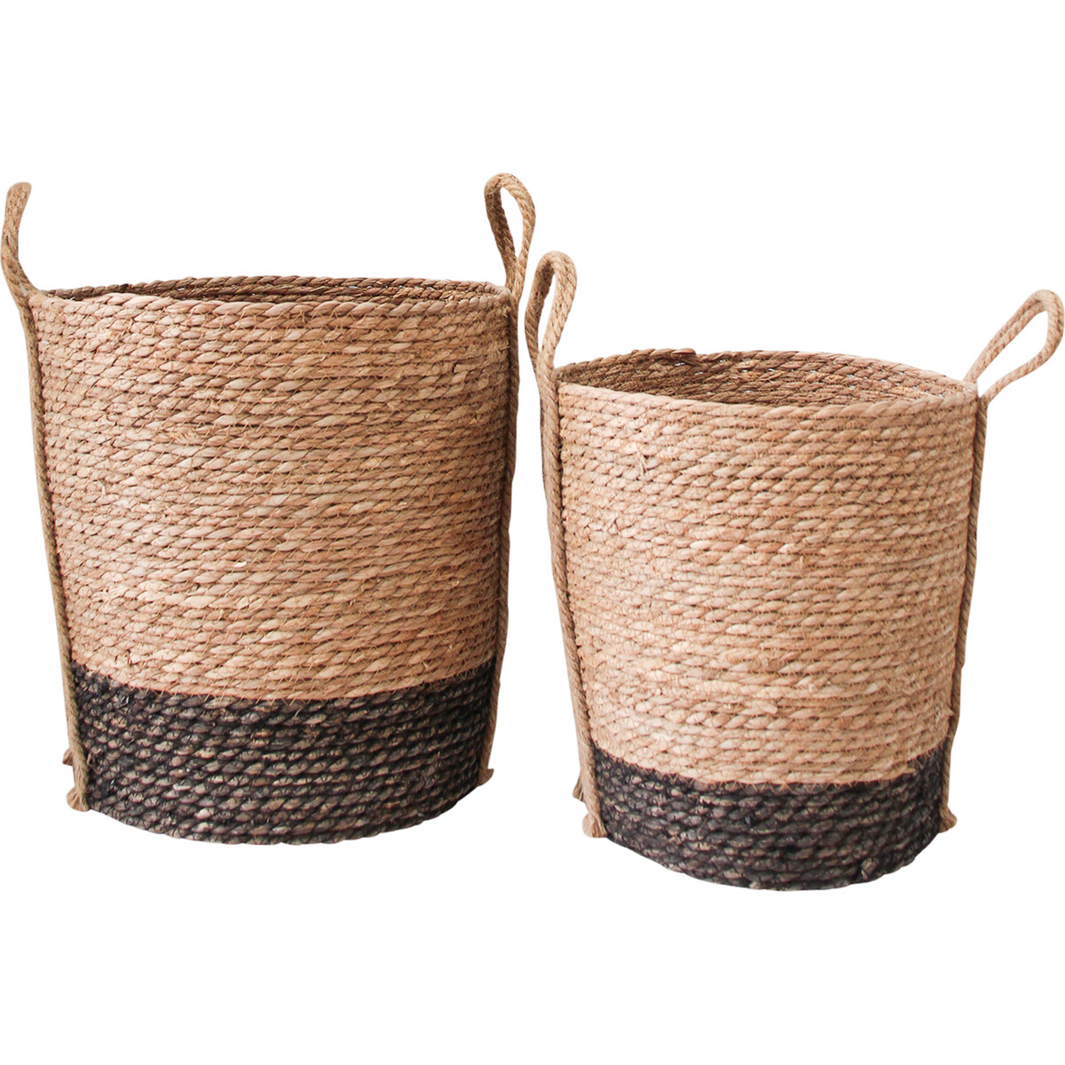 The baskets are sturdy yet lightweight-they come with handles that make carrying them very easy even when fully loaded. Crafted from straw and seagrass-the weave is dense and yet soft and pliable and the baskets will hold plenty of whatever you decide to use it for. The lower portion of the baskets are dark and thus tonal nature adds to its artisanal kind of beauty. The set has two -one smaller than the other and more importantly it would fit inside the larger one when not in use. Sits well balanced on its round base and the walls are stiff enough to hold on to its balance even when loaded. The handles are on the sides and shaped and placed in such a way that while carrying the basket will not swing. Will look delightful wherever in your home you intend to keep it.
