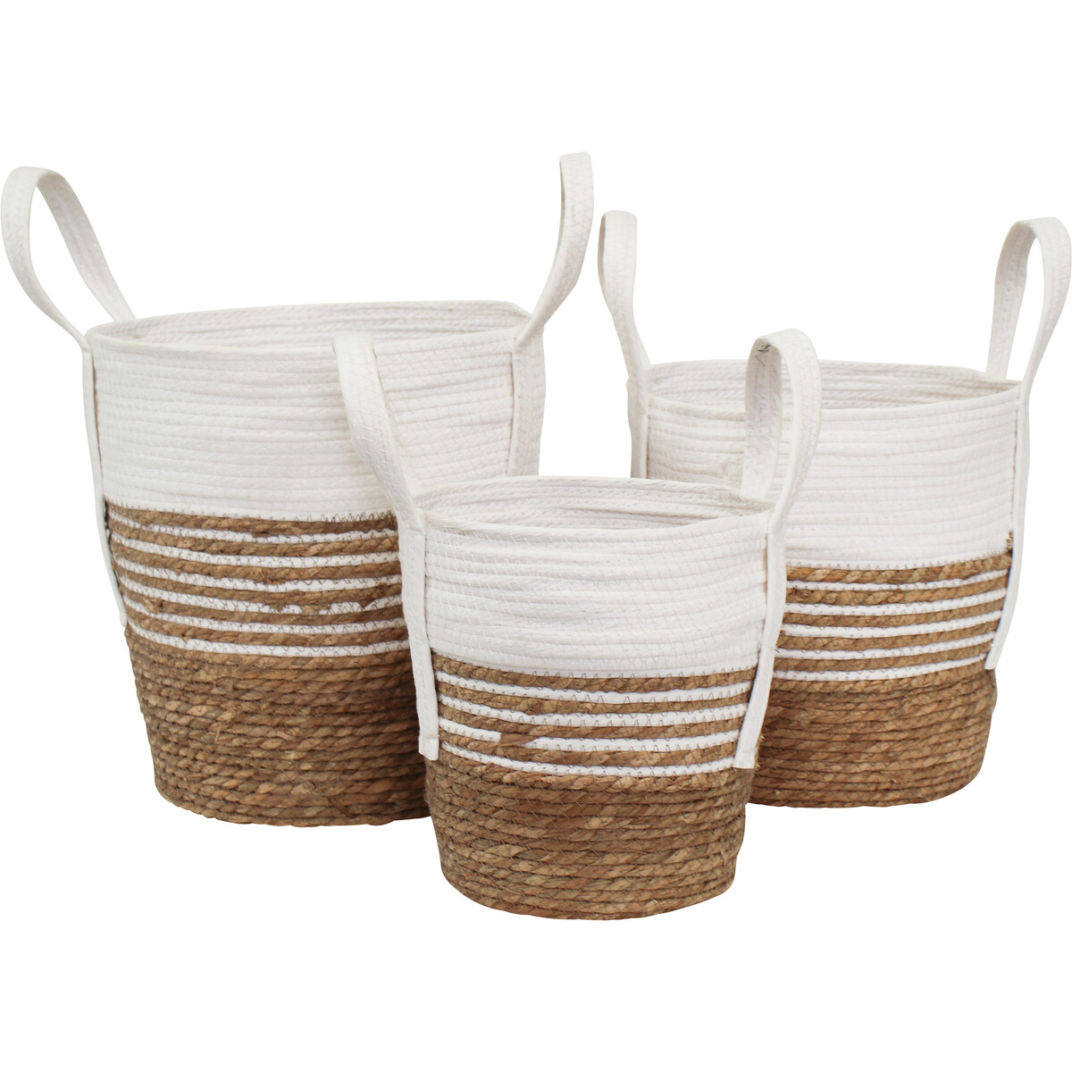 Skilfully hand woven through the use of 100% natural and organic sea grass and cotton materials; the base of the basket is finished in the natural sea grass brown colour while the middle of the basket is a striped design featuring a pristine white and brown. Above this striped section is a white painted top. Each of the three baskets contained in this set come with reinforced ergonomic handles which provide optimum support and easy carrying option for customers. All three baskets are made in differing sizes of small, medium and large.