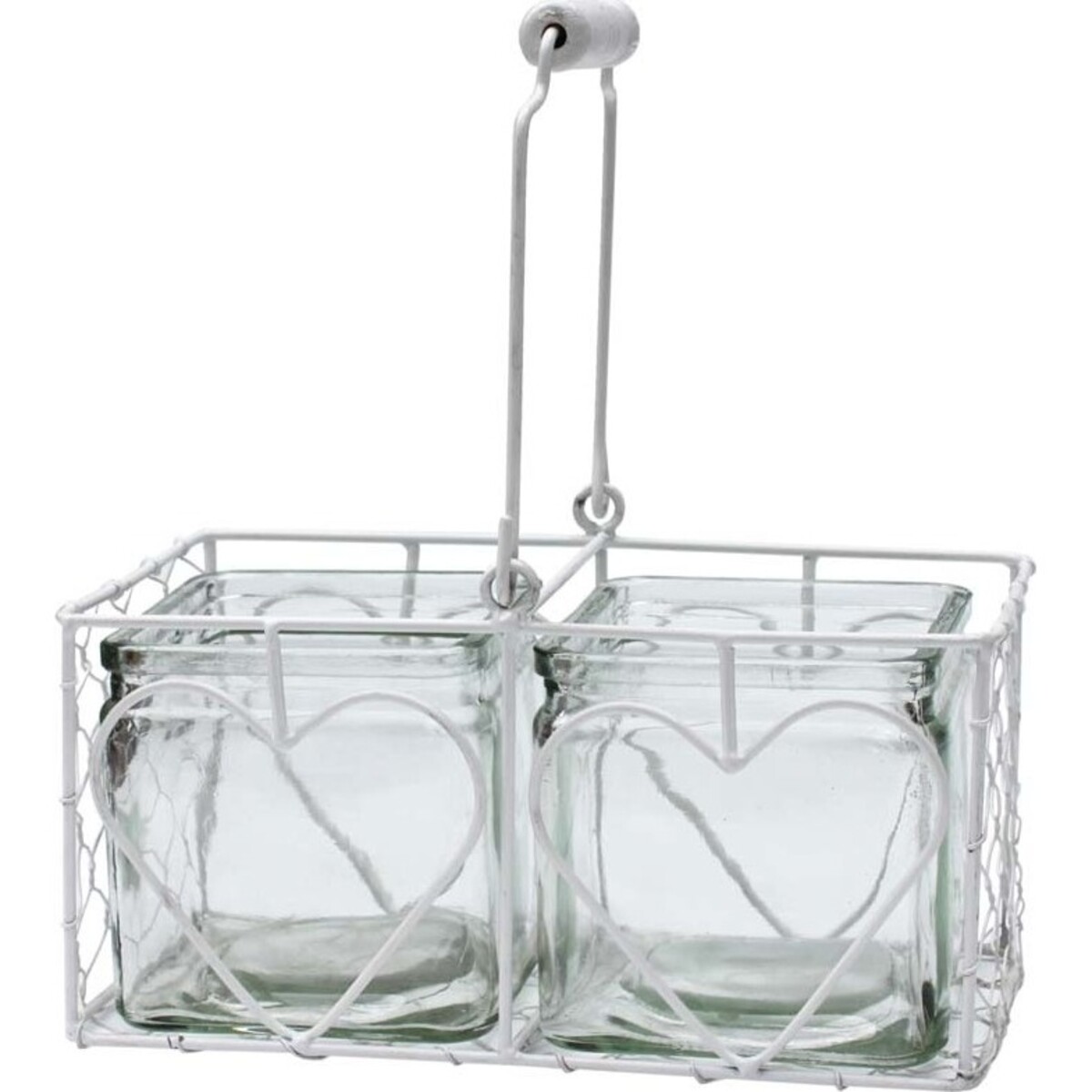 The heart handled basket is a white rectangular shaped basket made out of wire. The round wrapped wire handle has a quaint and old fashioned air. It has two separate chambers inside of it, in which are placed two cubular votive holders. These are perhaps suitable for candles but you can put anything that will fit inside. Each wire chamber in the basket is accompanied by a wire heart on either side, which are part of the basket. This darling basket and candle holder combination is perfect for the shabby and the chic. It has a neutral colour scheme that works well in a large variety of environments. All you have to decide now is what scent of candle you want.