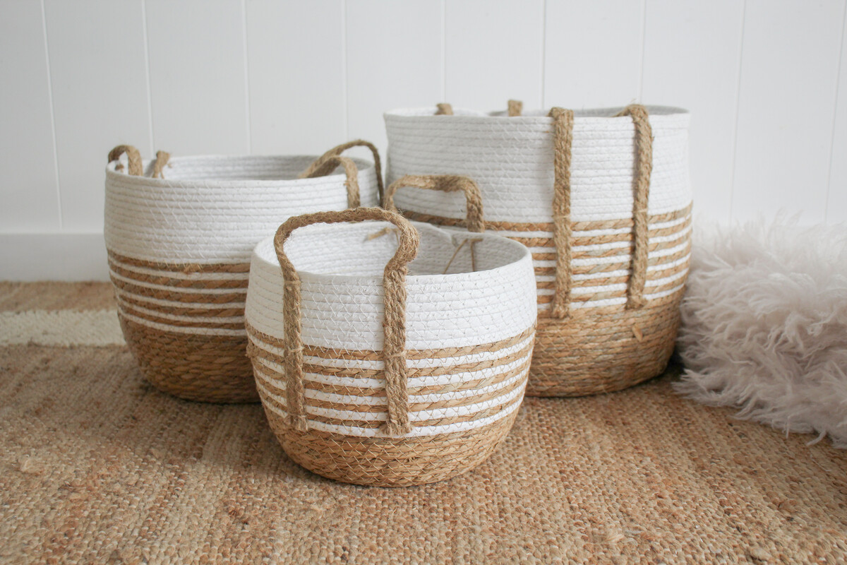 Their sizes (L: 35x30cm / M: 30x24cm / S: 25x20cm + handles) stack together for easy display, and work beautifully across coastal, modern, or even classic spaces. Pair them together or try styling them separately – flexible storage makes happy homes.