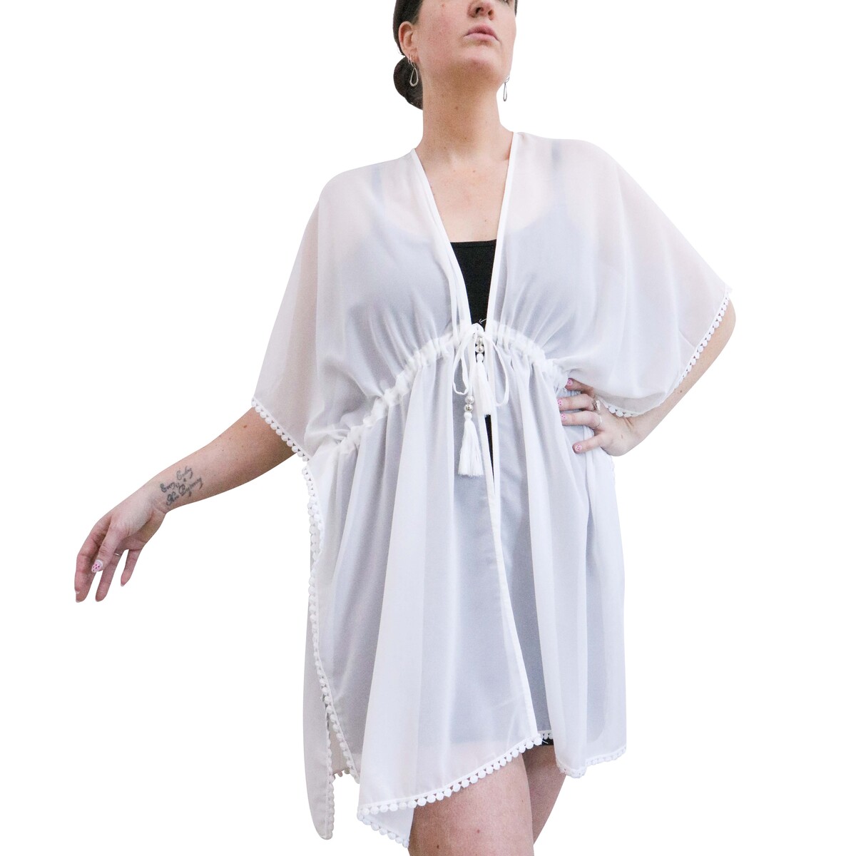 This beach cover-up in crisp white is absolutely one of those pieces that works for every customer - it's simple, classic, and just that bit playful with the floaty sleeves. And it’s really easy to wear - one size fits most, so it just flatters every shape from XS-XL. We've found that the adjustable drawstring at the front gives a little extra definition around the waist, but keeps things relaxed enough for all-day comfort.