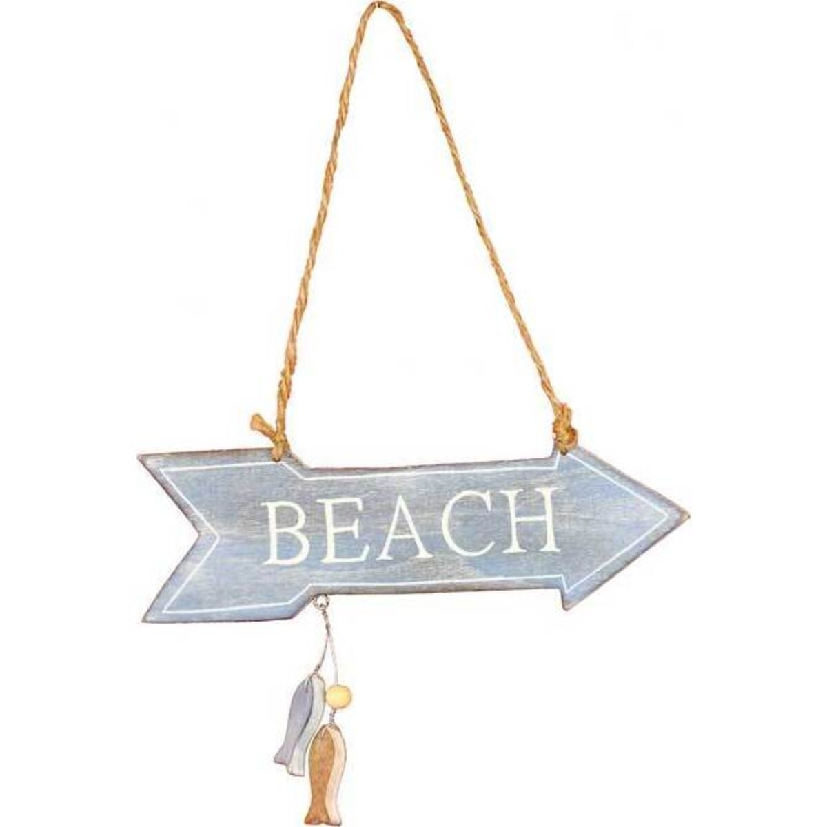 This sign consists of a blue arrow that has a white border, and in white lettering, says "Beach." From the bottom are two little dangling fish, and on the top is a thin tan rope formed into a loop to allow for easy hanging. Whether you display this little sign in your home or at your beach house, you give it to your friend or keep it for yourself, it's going to make a wonderful addition to any home.