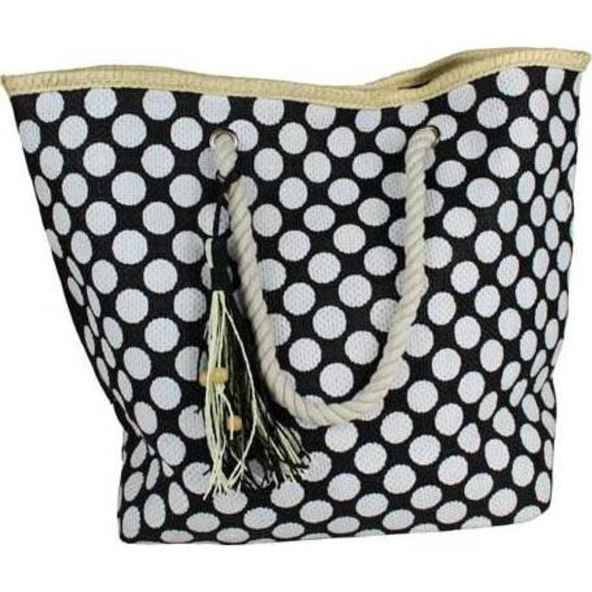 Totes come in real handy when the day long outing would need one to carry numerous things to see you through the day-while purses are fashionable a stylish tote is exactly what one needs and this white polka dotted tote on a black background summarily answers that need. Made from lightweight yet strong paper g=fabric , this tote is not only stylish enough to make one’s outfit look all the more attractive but the very fact that the tote has wide mouth , a large size and soft easy to grasp handles , makes it truly worth owing for those days when space is a constraint in any other bag. The little white and black tassle attached to the handles and the little neat trimming all along the edges of the bag makes it all the more attractive giving the tote a definition and inherent style.